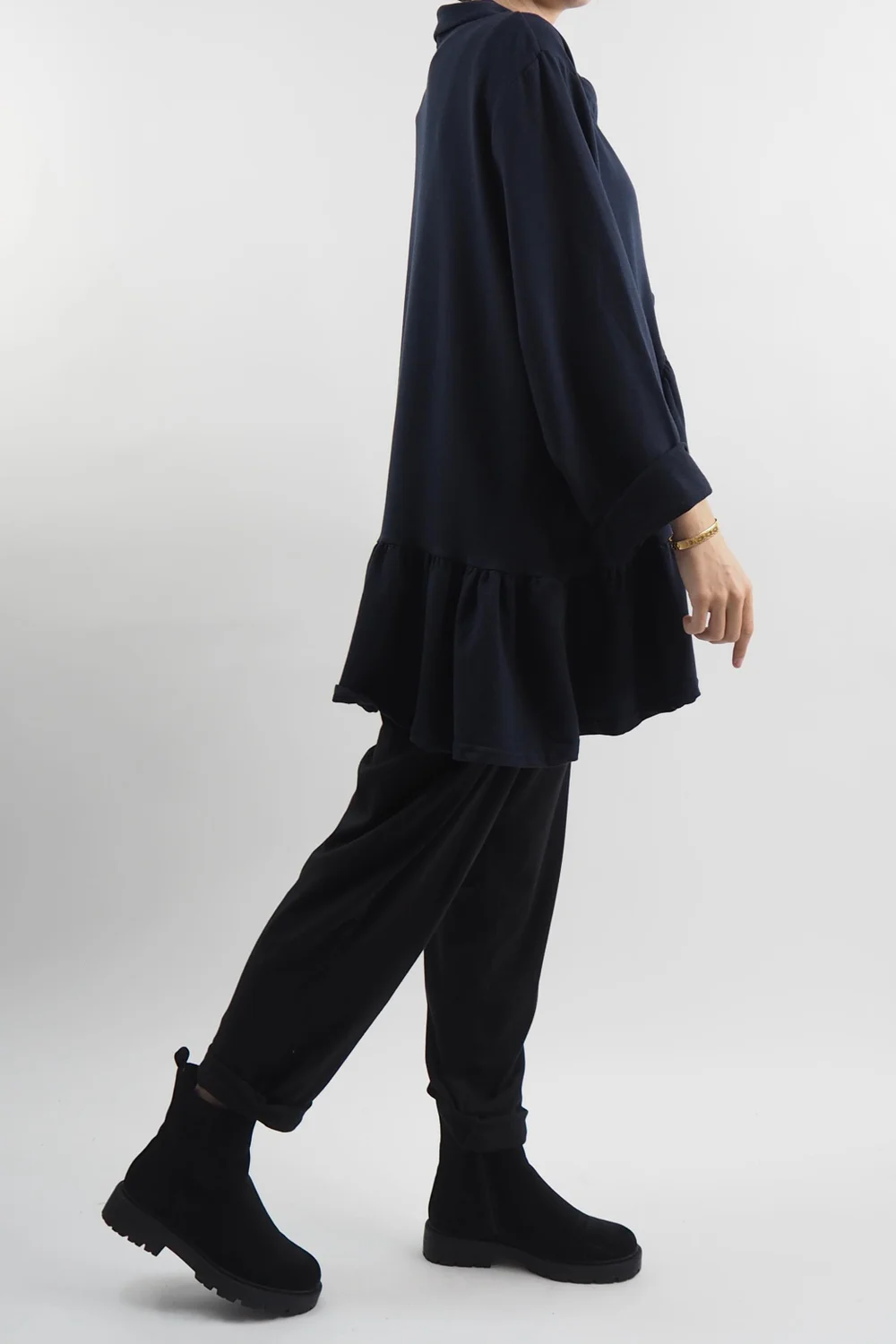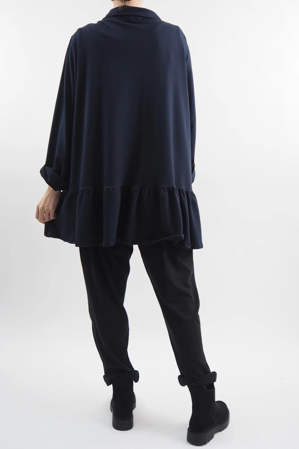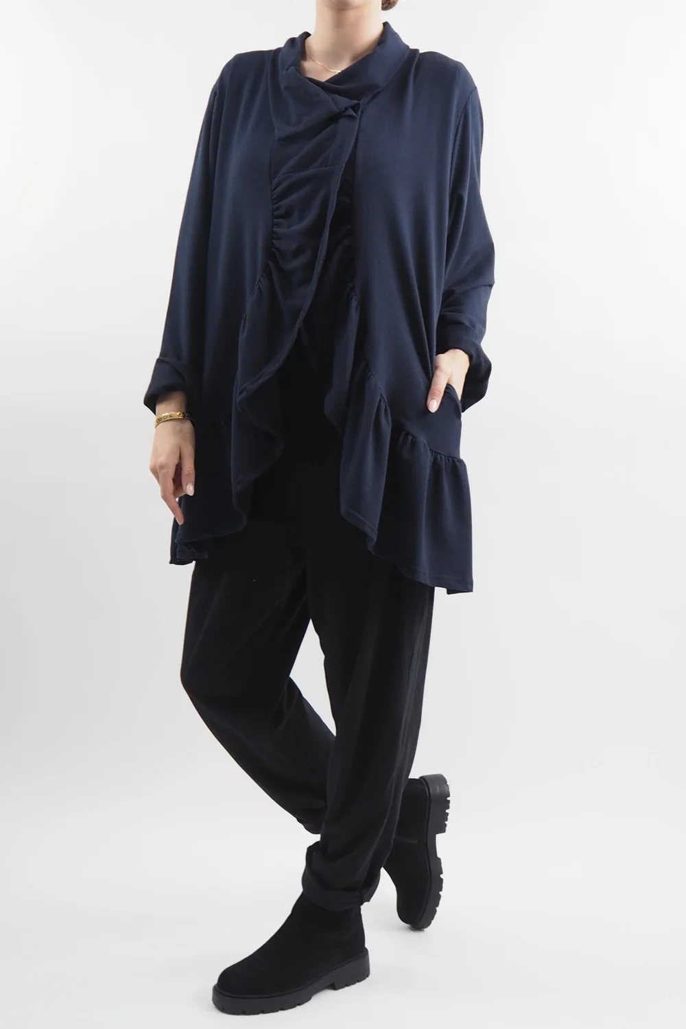 Elevate your casual-chic game with this effortlessly stylish lightweight jacket: the Made in Italy Apres Ruffle Jacket in Ink, navy blue tone, a must-have piece for your autumn-winter wardrobe. Crafted from 100% cotton, it combines comfort and fashion seamlessly. The jacket features exquisite cross-front ruffle details that add a touch of femininity and flair to your outfit, pair with our Made in Italy Fine Jersey Polo Neck and Bodhi Slim Leg Trousers for a modern, urban look that effortlessly combines comfort and style.