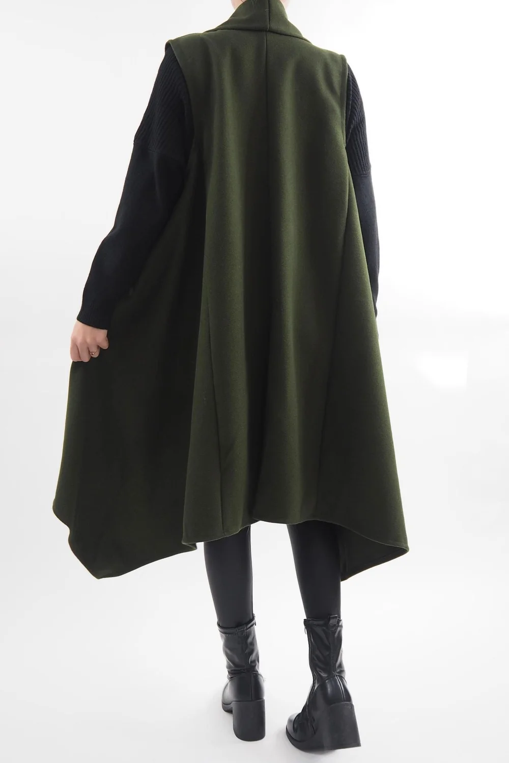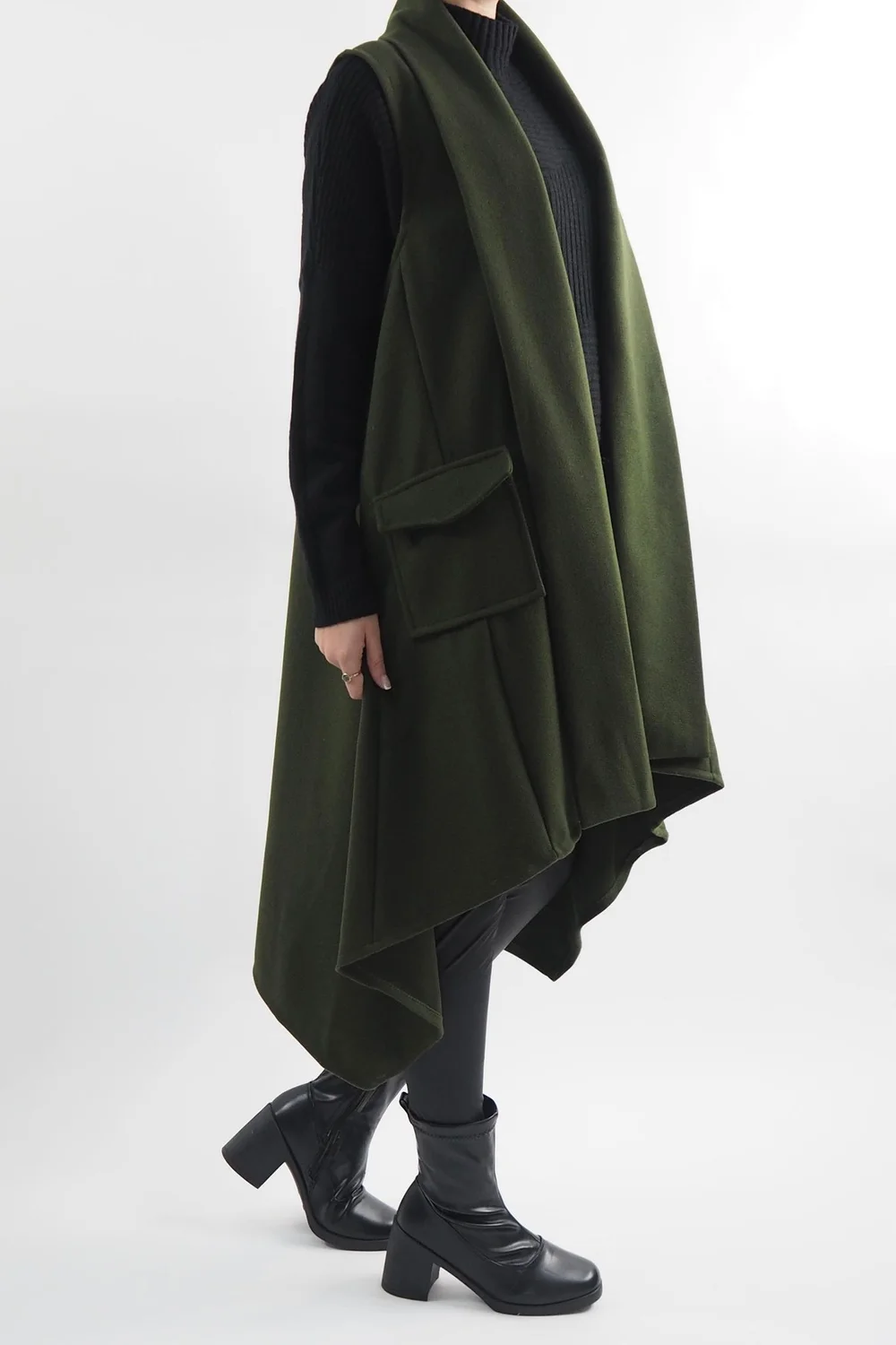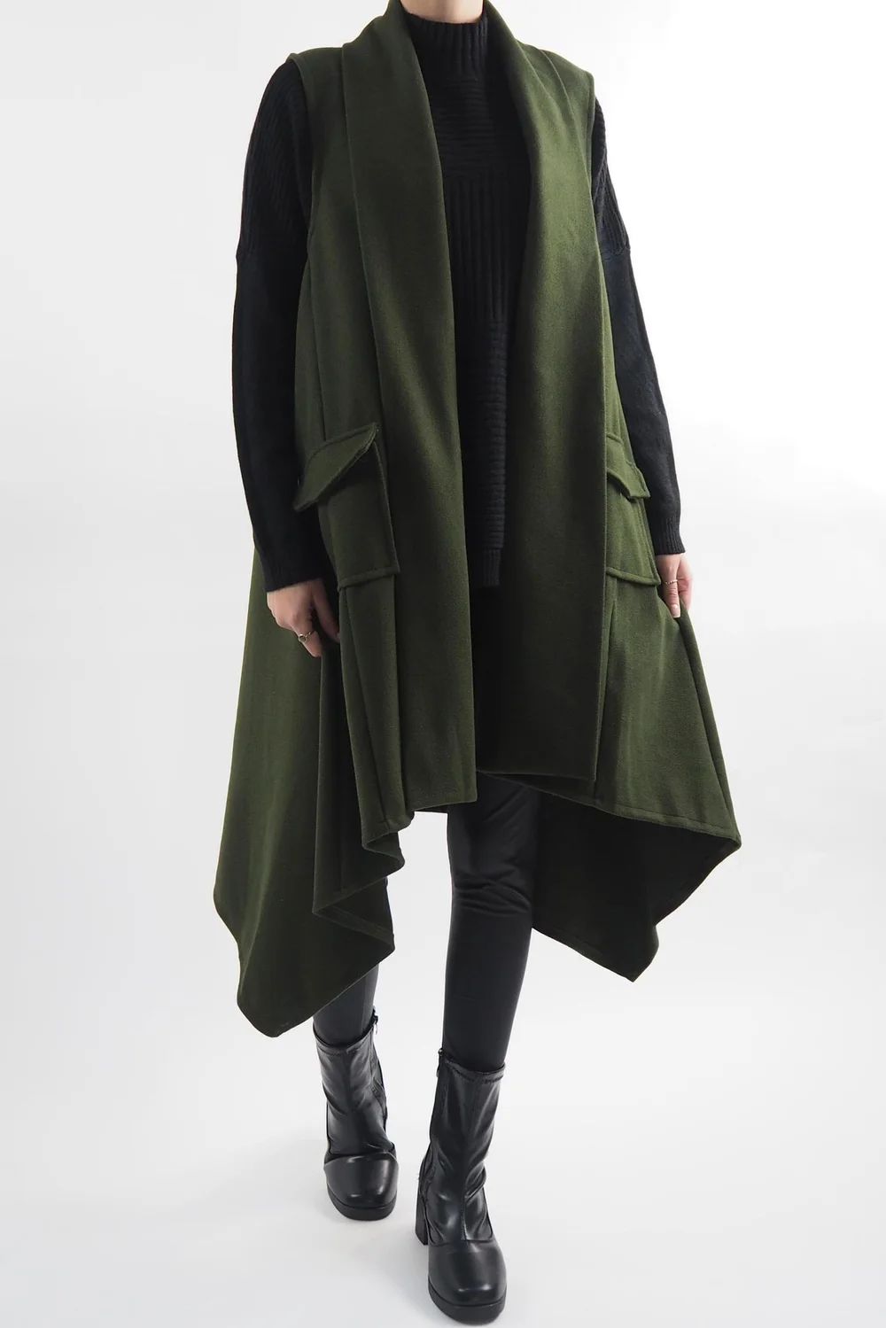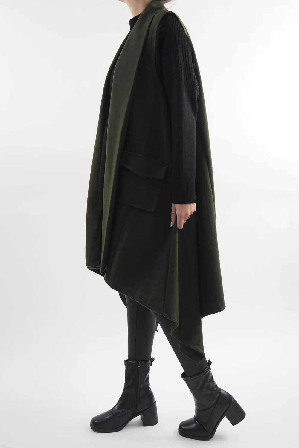 Introducing the epitome of timeless elegance, our Made in Italy Belgravia Weekend Gilet in a Khaki, Green tone, this classic, longline, trapeze shape gilet is a must-have addition to your wardrobe. Its elongated silhouette not only flatters all body types but also provides ample coverage, making it the perfect choice for layering. Whether you’re aiming for a chic and polished ensemble, styled with our Pesca leather-look leggings or opting for a more relaxed, athleisure-inspired look, this gilet proves its adaptability as a fashion essential.Â