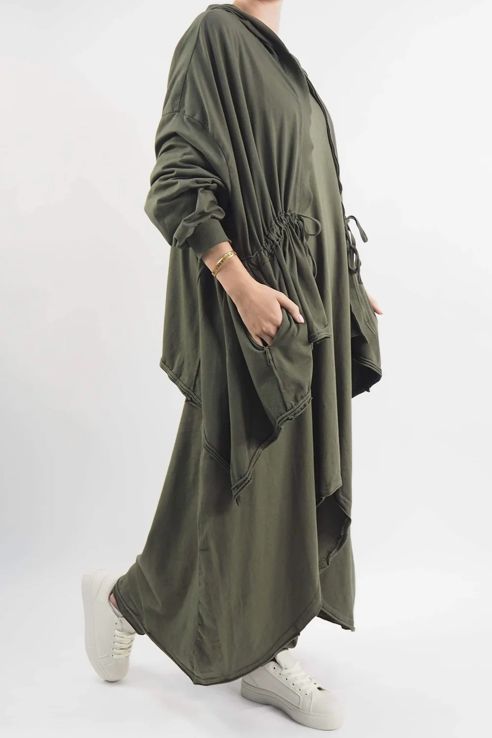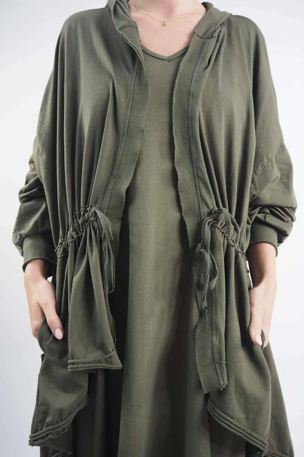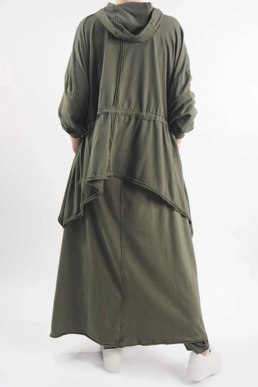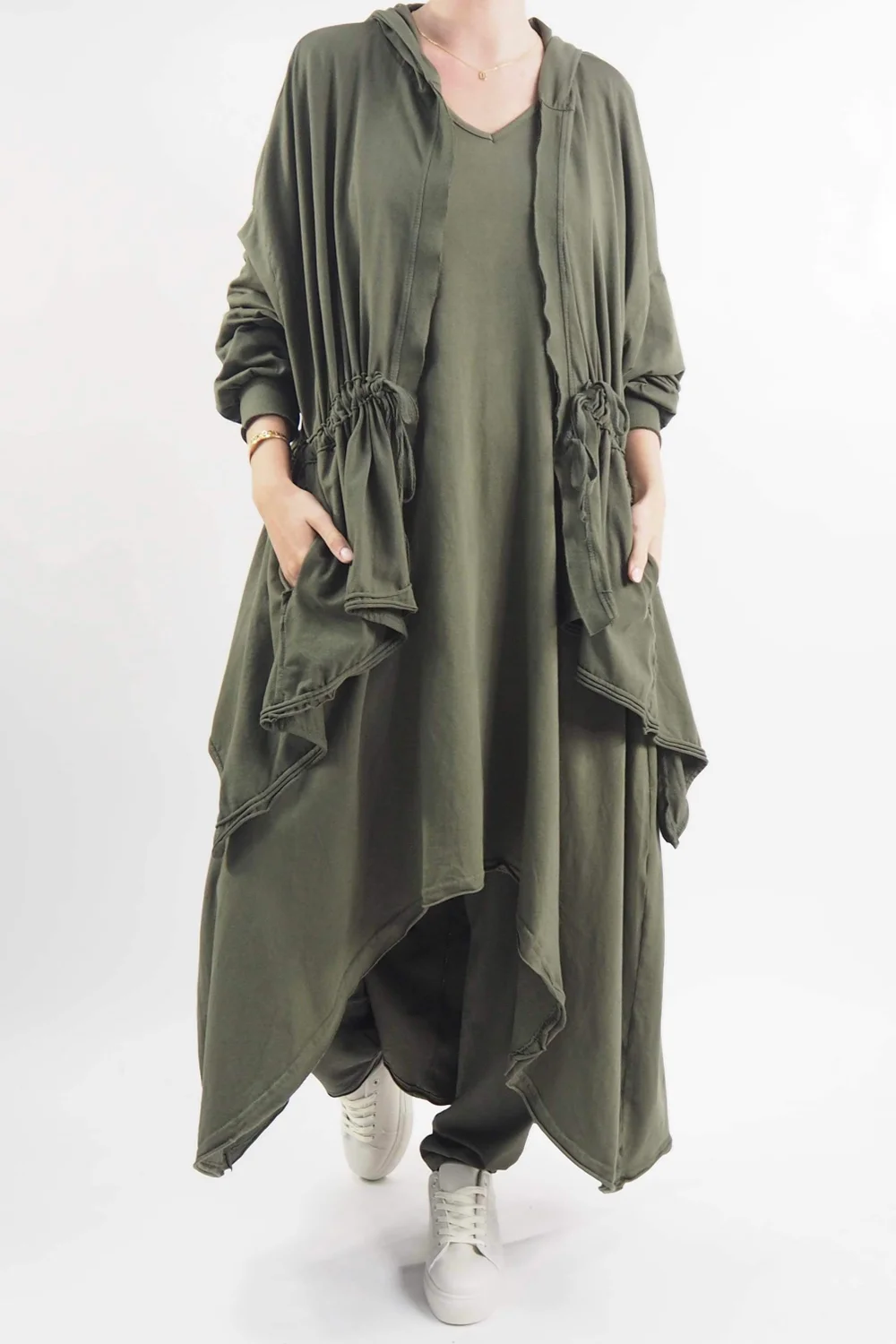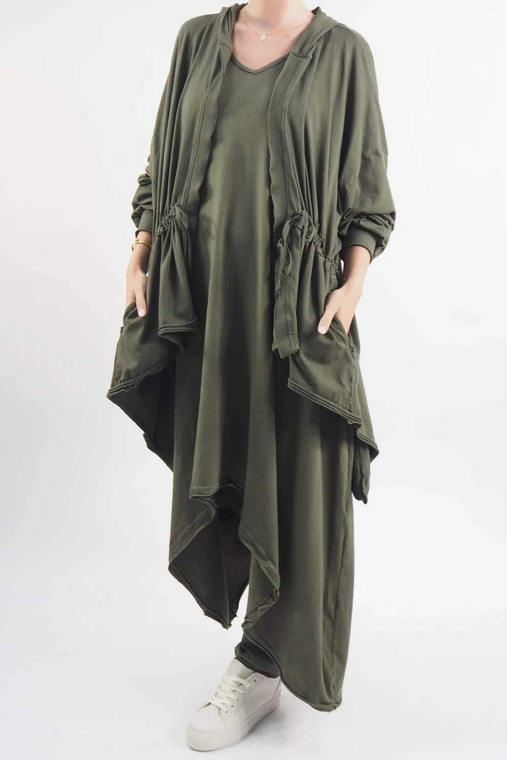 Introducing the ultimate must-have for this season’s wardrobe: our Made in Italy Bodhi Goody Hoodie in Classic Bonsai, khaki green, a super cool, seam detail, cinch waist hoodie crafted in a lightweight stretch cotton that effortlessly blends style and comfort. Style with our Made in Italy Bodhi Archie Dress & Bodhi Slim Leg Pants for the perfect Lagenlook look.