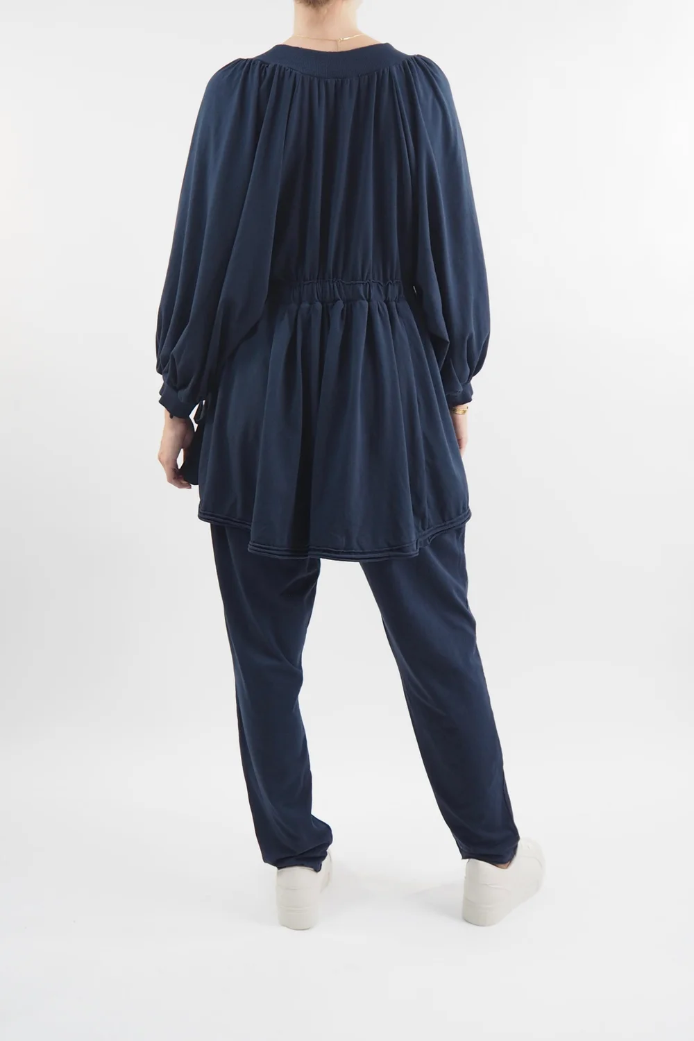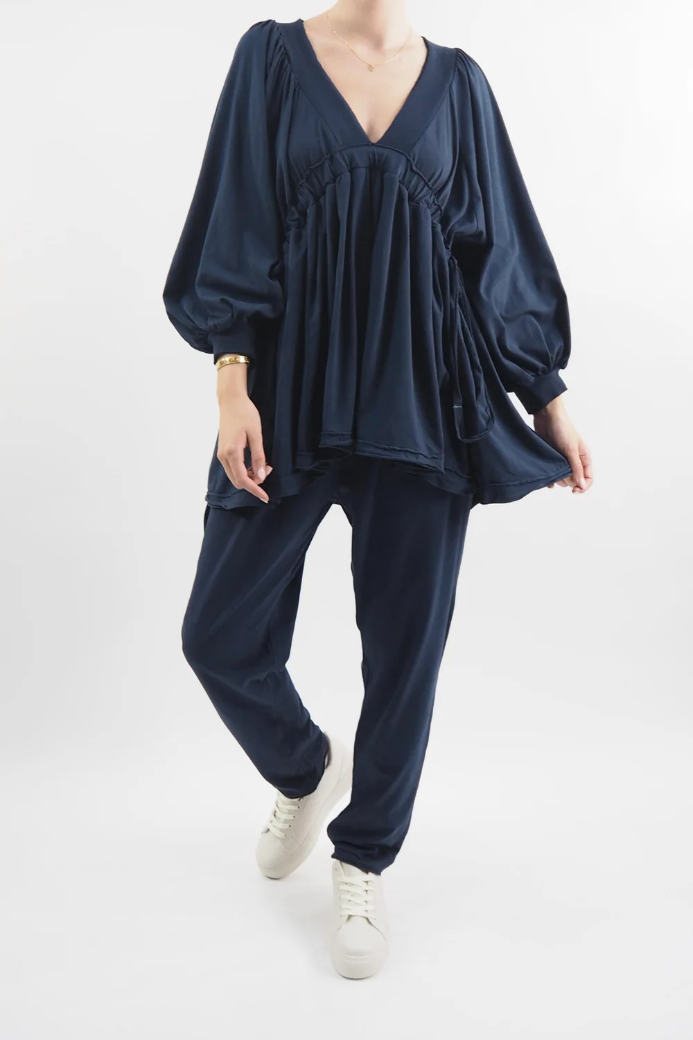 The Made in Italy Bodhi Rock The Smock Top in Ink, navy blue tone : The epitome of effortless elegance: our latest creation, a gorgeous, lightweight smock top crafted from the finest stretch cotton. This versatile piece seamlessly marries comfort and style, making it a must-have addition to your wardrobe. The lightweight, breathable fabric drapes gracefully, providing a flattering silhouette for all body types. Its enchanting design features an adjustable cinch waist, allowing you to customize the fit to your preference, ensuring a perfect and comfortable look every time. Style with our Made in Italy Bodhi Slim Leg Pants for the perfect look. Embrace the beauty of comfort and style with this exquisite piece that will become your new go-to for any occasion.