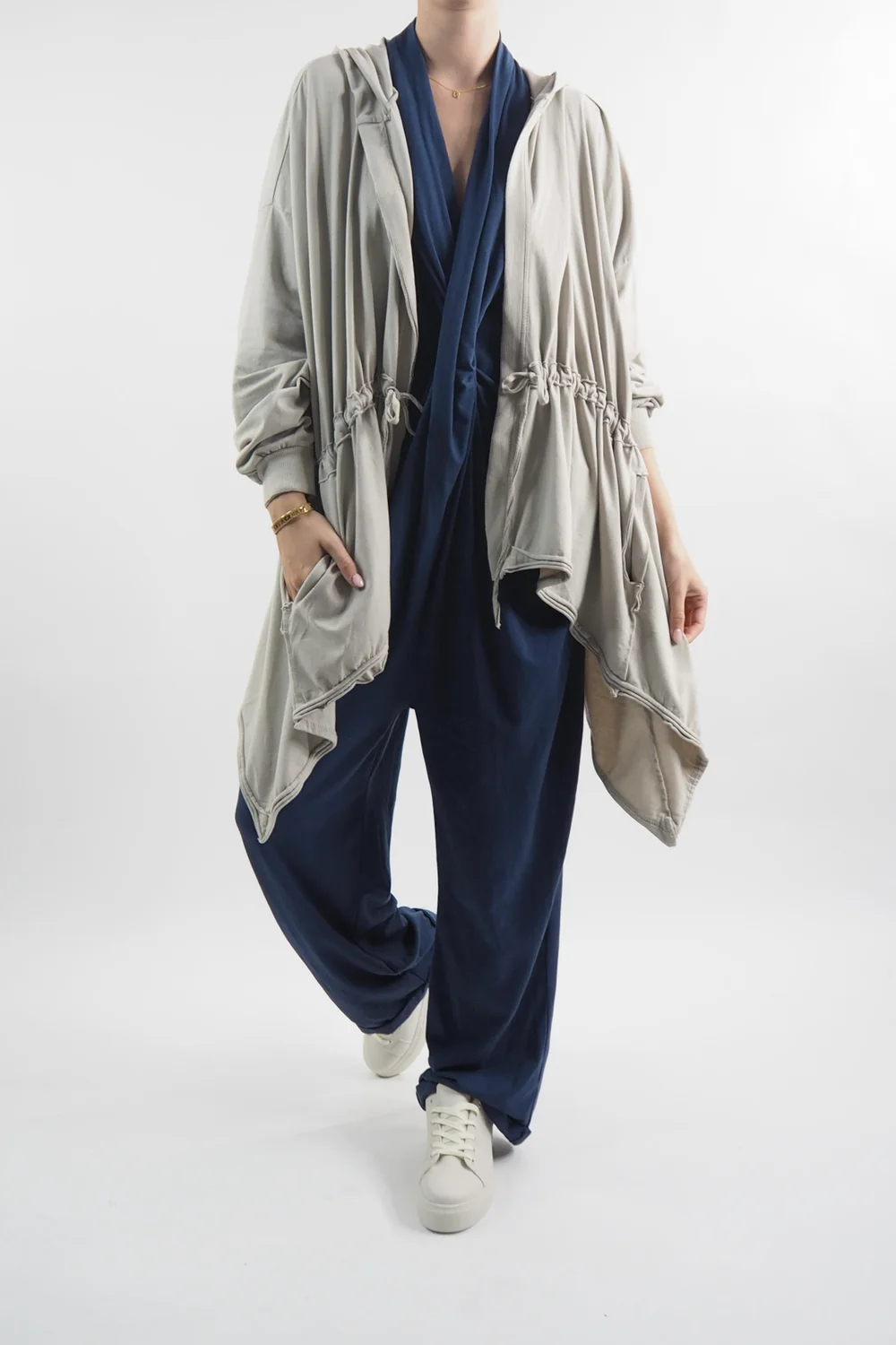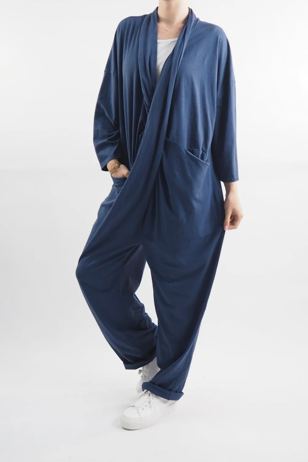 The Made in Italy Bodhi Twist Jumpsuit in Midnight Blue embodies effortless sophistication with its exquisite design elements. The front twist detail adds a touch of intrigue to the classic jumpsuit silhouette, creating a focal point that’s both flattering and chic. Its practicality is elevated by the inclusion of pockets, seamlessly blending style and convenience. The long sleeves provide a sense of versatility, making it suitable for various occasions and seasons. Crafted with meticulous attention to detail, this jumpsuit exemplifies the timeless elegance and craftsmanship associated with Italian fashion, making it a must-have addition to any discerning wardrobe.