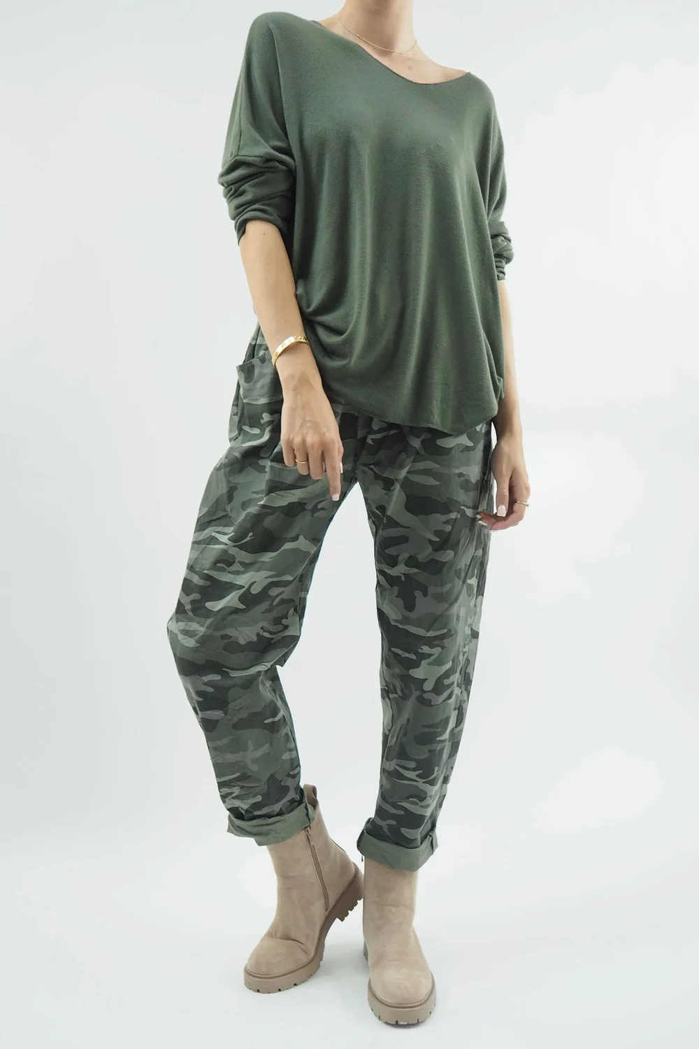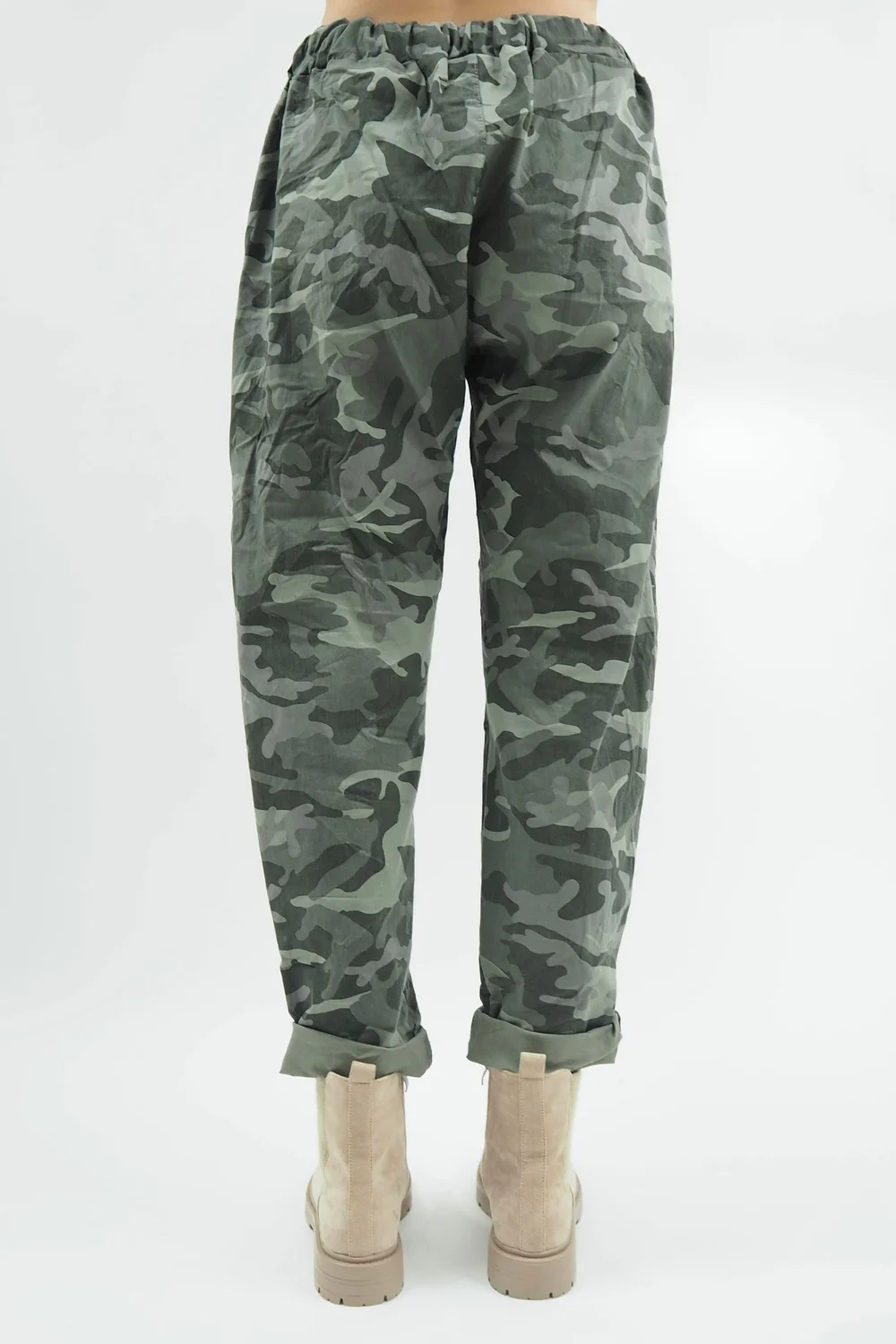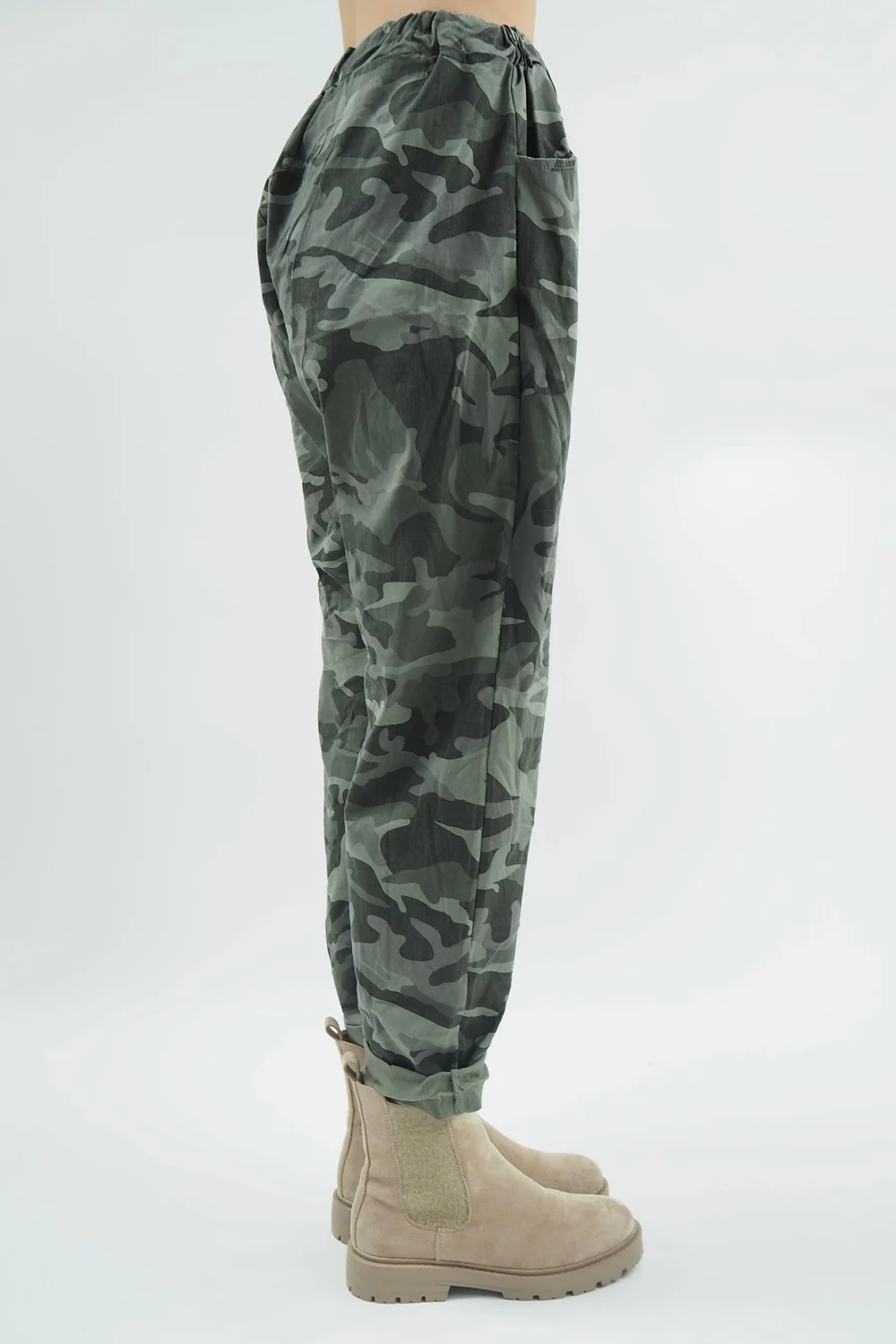 Introducing the epitome of effortless, edgy style and comfort : our Made in Italy Camo Classic Magic Trousers in classic Khaki, green tones. These extraordinary trousers are a game-changer, seamlessly blending unparalleled comfort and timeless elegance. Our Made in Italy Camo Classic Magic Trousers possess a remarkable elasticity that adapts to your every move, making them a dream to wear throughout the day and night.