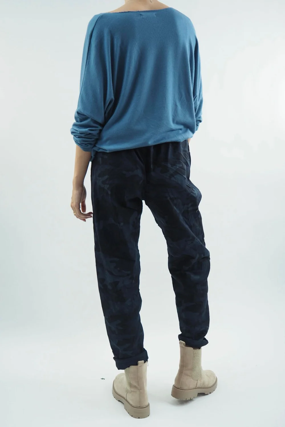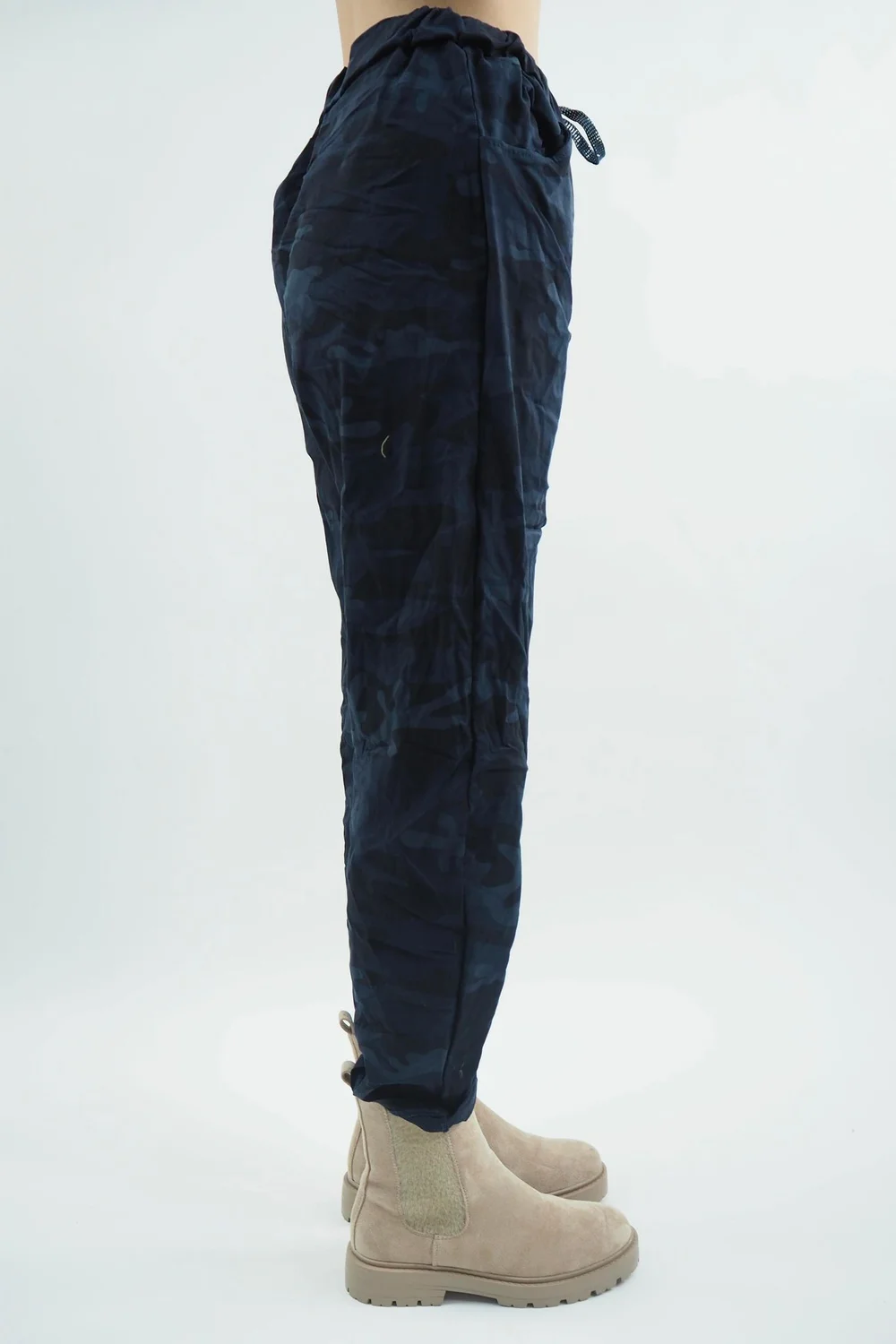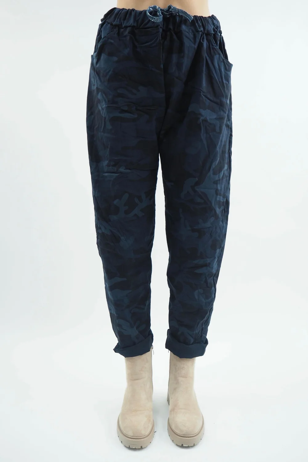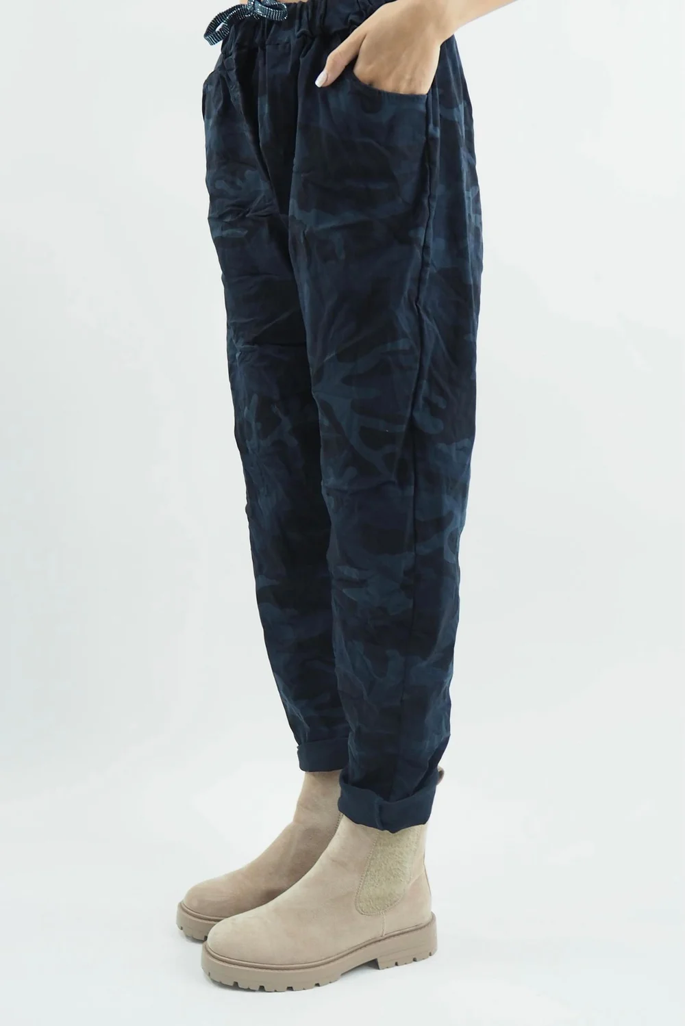 Introducing the epitome of effortless, edgy style and comfort : our Made in Italy Camo Classic Magic Trousers in classic Navy, blue tones. These extraordinary trousers are a game-changer, seamlessly blending unparalleled comfort and timeless elegance. Our Made in Italy Camo Classic Magic Trousers possess a remarkable elasticity that adapts to your every move, making them a dream to wear throughout the day and night.
