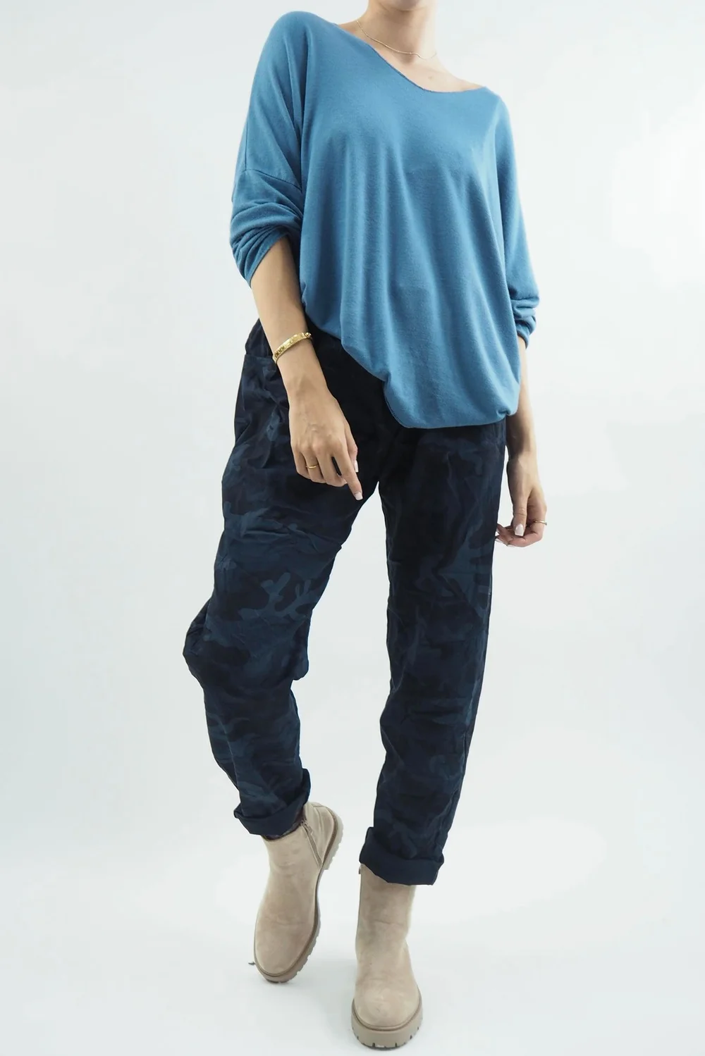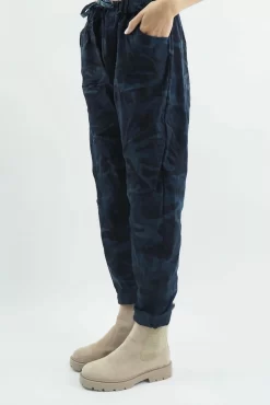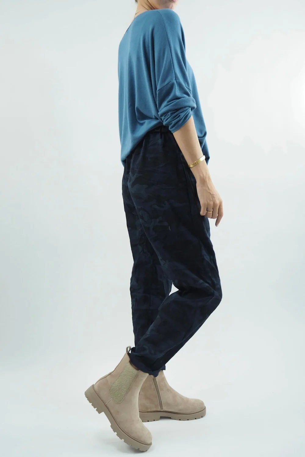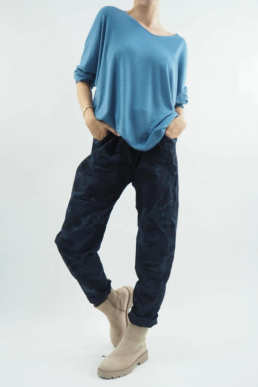 Introducing the epitome of effortless, edgy style and comfort : our Made in Italy Camo Classic Magic Trousers in classic Navy, blue tones. These extraordinary trousers are a game-changer, seamlessly blending unparalleled comfort and timeless elegance. Our Made in Italy Camo Classic Magic Trousers possess a remarkable elasticity that adapts to your every move, making them a dream to wear throughout the day and night.