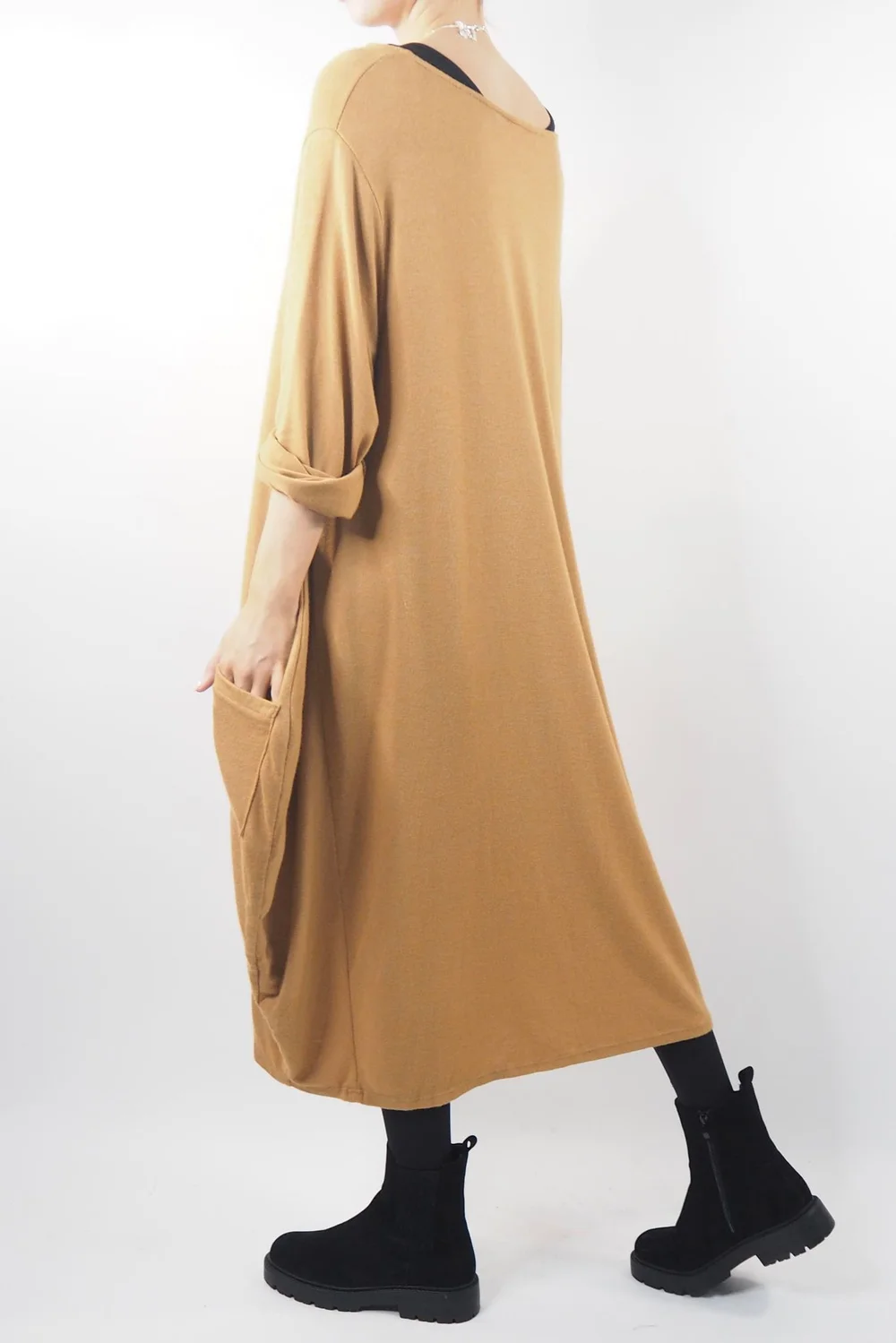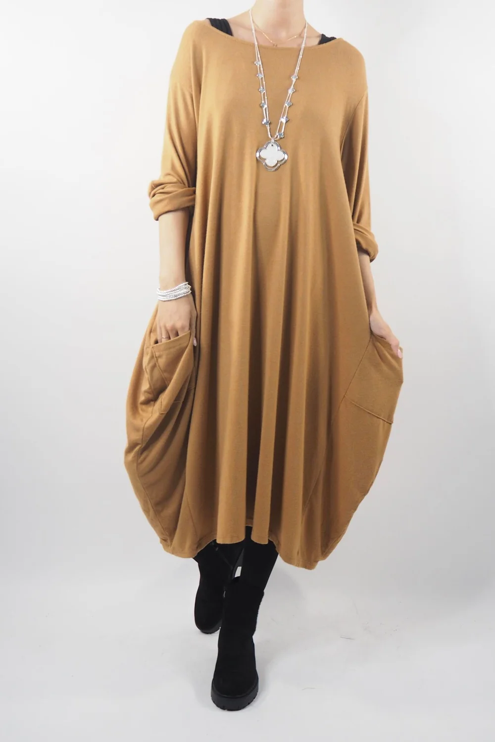 Introducing the epitome of elegance and comfort: the Chalet Classic Cocoon Knit Dress in Camel, tan brown tone, from Made in Italy Clothing. A true wardrobe essential, this one-size-fits-all marvel is the perfect piece, regardless of your body shape. Crafted with the utmost precision, this ethereal creation boasts a lightweight design that lends itself perfectly to the art of layering. A piece that promises to be your trusty companion for every season, this cocoon dress is a seamless fusion of comfort and style. Style with tights and boots for the perfect look.