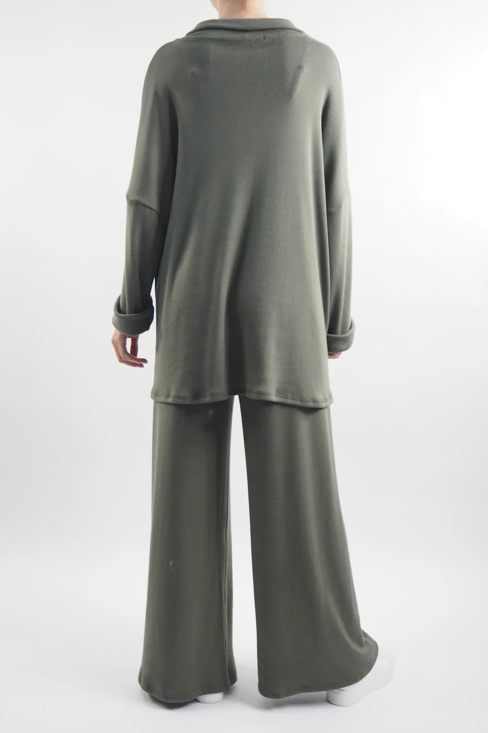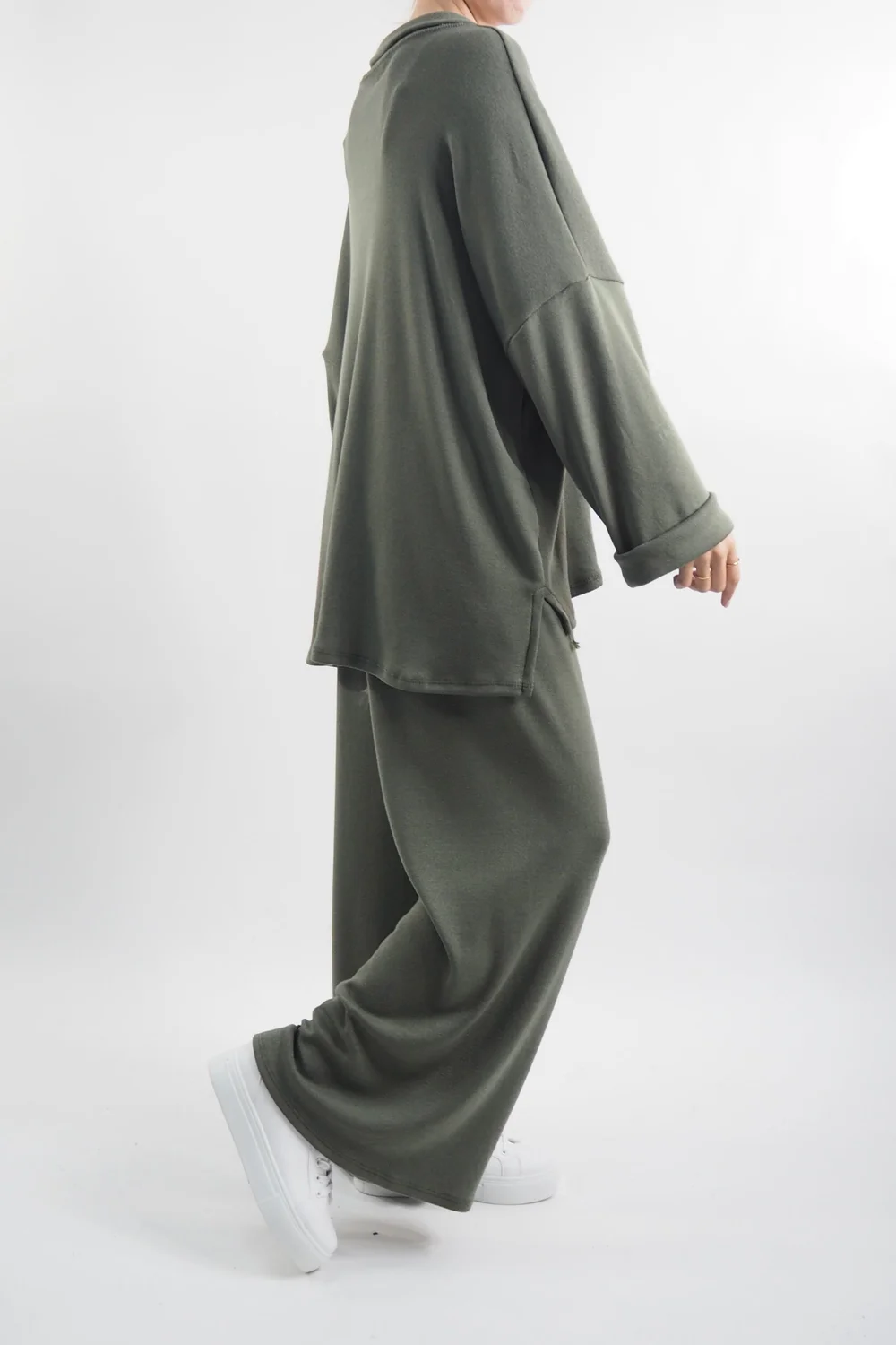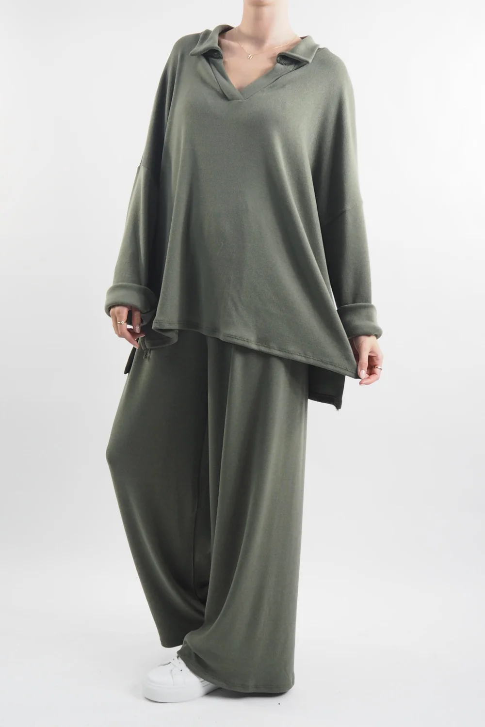 Indulge in the ultimate comfort and style with our super soft, relaxed, and oh-so-cosy set : the Chalet Collared Soft Knit Set in Bonsai, khaki green tone, from Made in Italy Clothing, crafted for those moments of everyday relaxation, this set is a must-have for your autumn wardrobe. The wide-leg, knit trousers boast an elastic waistband, ensuring a perfect fit while allowing you to move with ease. Paired with a matching knit collared top, this ensemble effortlessly combines style and comfort.