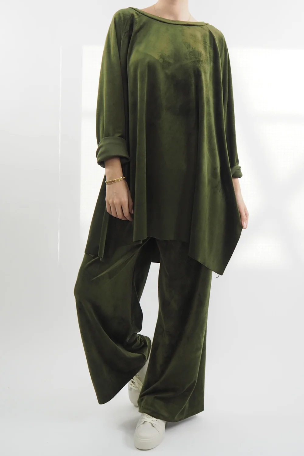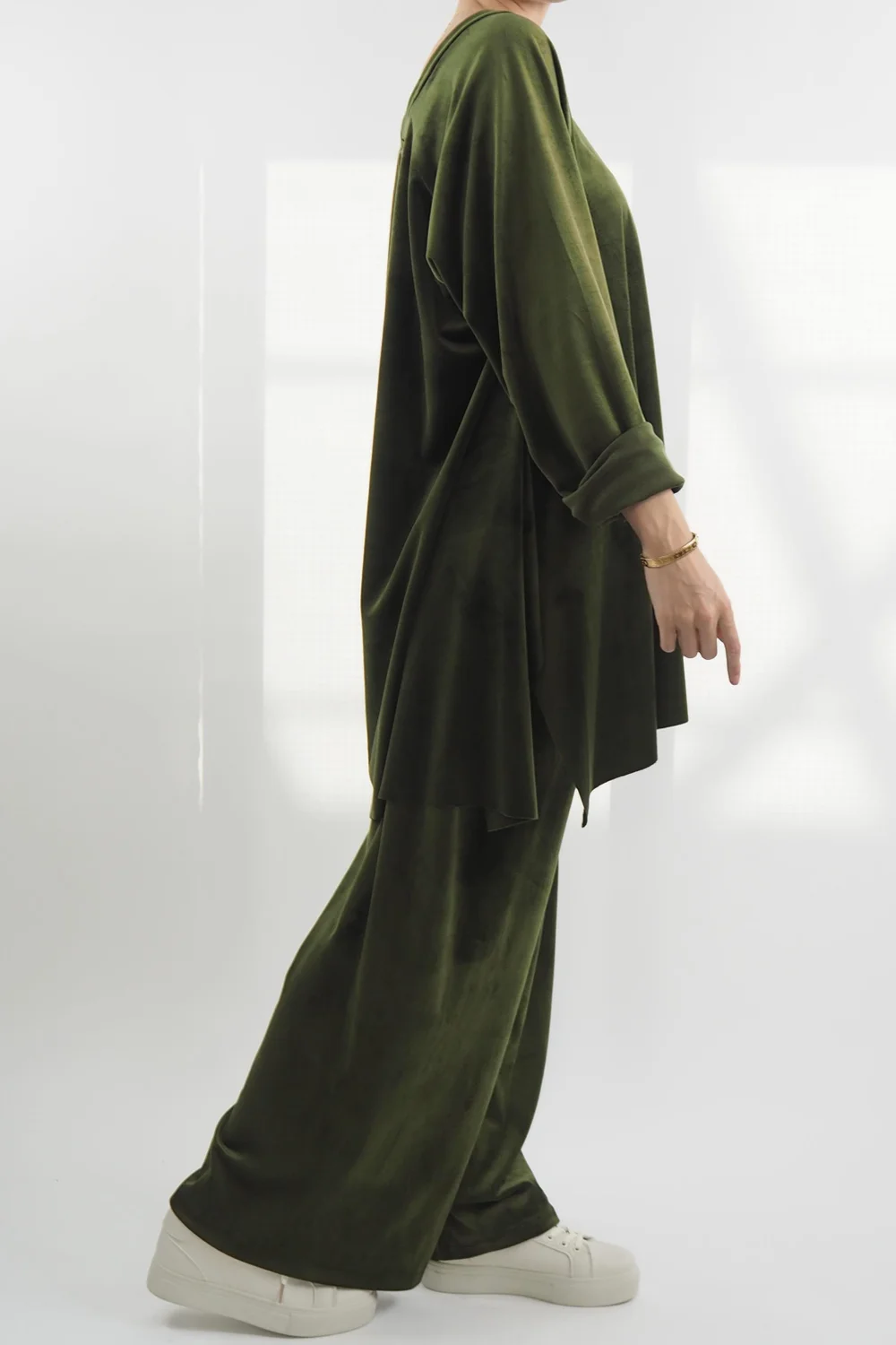 Indulge in ultimate comfort and style with our luxurious Made in Italy Chalet Soft Stretch Velour Set in Deep Olive, green tone – the epitome of chic loungewear! Crafted with a plush velvety texture, this set is designed for those who refuse to compromise on fashion even during downtime. The relaxed-fit top features a flattering round neckline, ensuring a flattering silhouette while keeping you cosy. Paired with the matching velour pants, it’s an ensemble that effortlessly combines comfort and elegance. Whether you’re curled up with a book or sipping a latte at home, this set promises to elevate your lounging experience to a whole new level of glamour and relaxation.