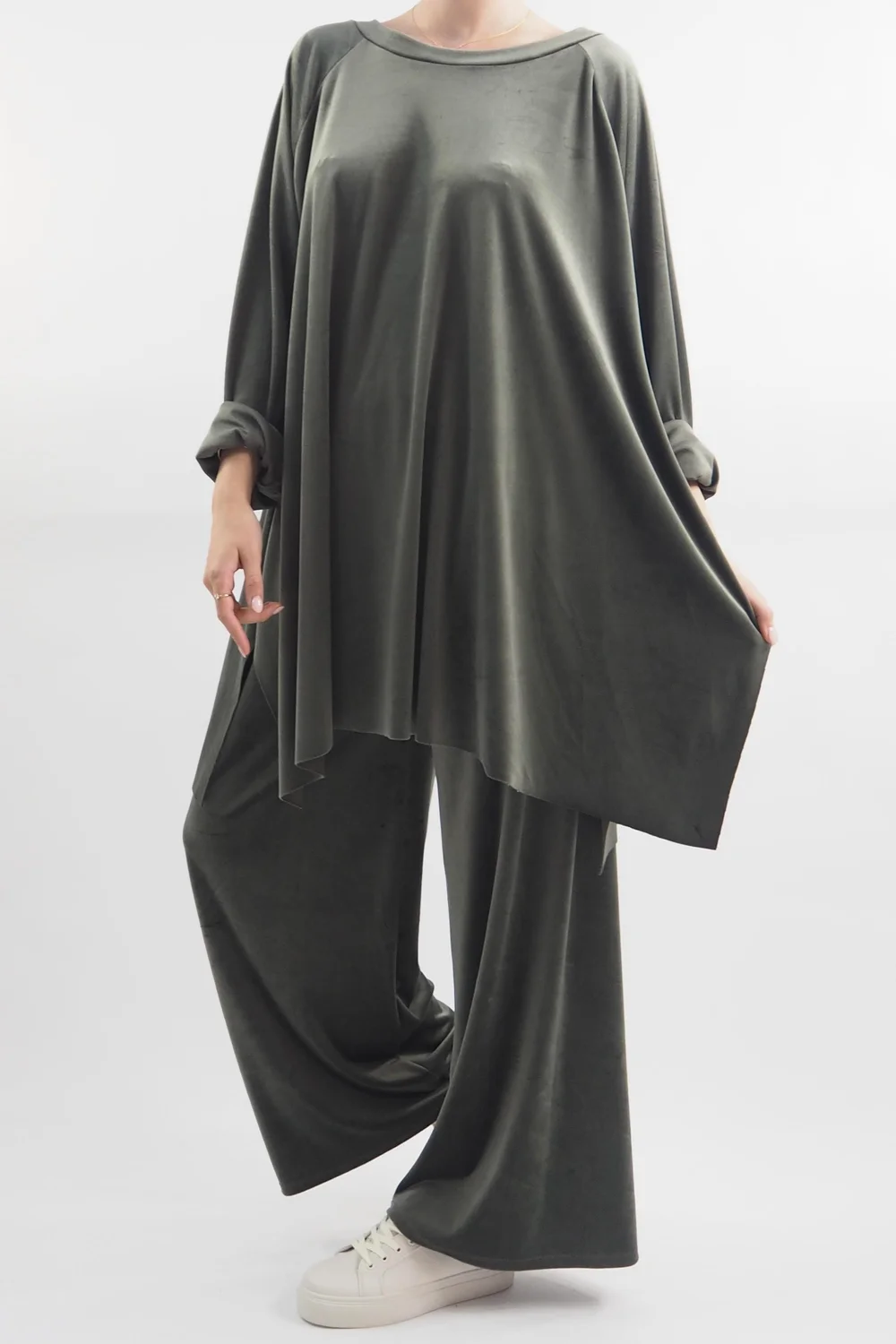 Indulge in ultimate comfort and style with our luxurious Made in Italy Chalet Soft Stretch Velour Set in Soft Khaki green tone – the epitome of chic loungewear! Crafted with a plush velvety texture, this set is designed for those who refuse to compromise on fashion even during downtime. The relaxed-fit top features a flattering round neckline, ensuring a flattering silhouette while keeping you cosy. Paired with the matching velour pants, it’s an ensemble that effortlessly combines comfort and elegance. Whether you’re curled up with a book or sipping a latte at home, this set promises to elevate your lounging experience to a whole new level of glamour and relaxation.