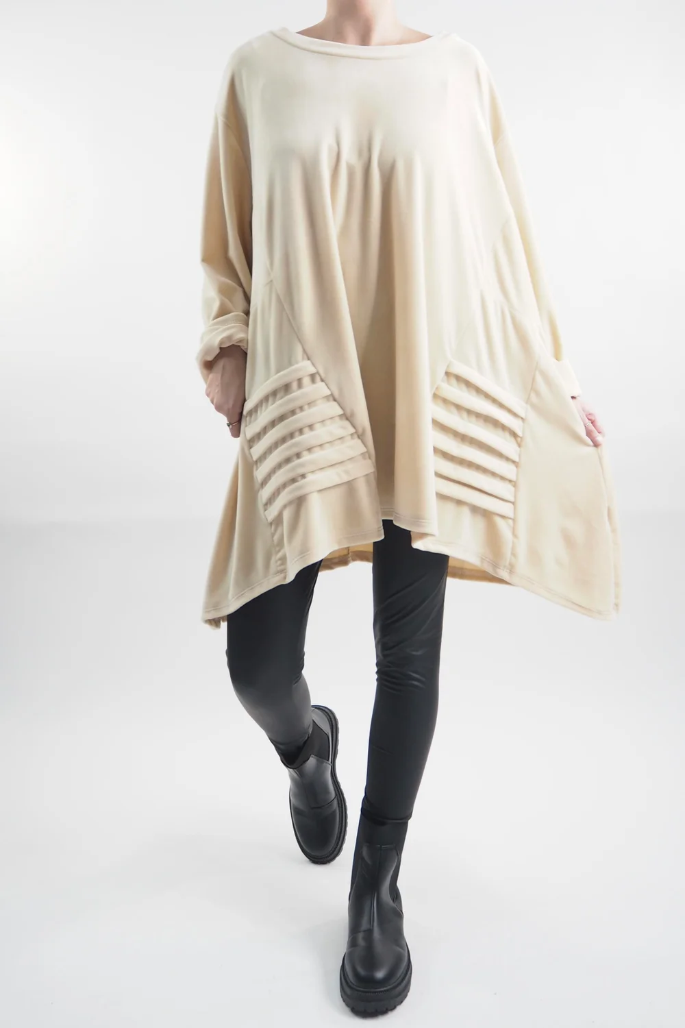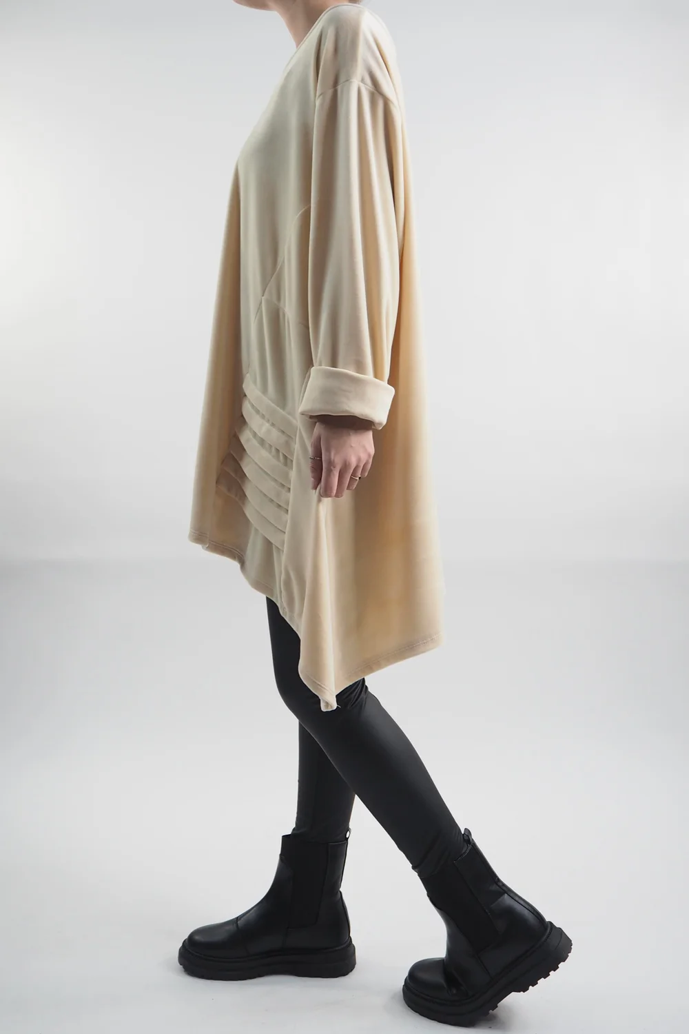 Luxurious comfort this autumn with our Made in Italy Chalet Vente Top in Stone beige, adorned with exquisite pleat details that elevate loungewear to the height of fashion. Crafted for the connoisseur of relaxation, this top caresses the skin in the softest velour, promising unparalleled cosiness during the crisp fall evenings. The meticulous pleating adds a touch of sophistication, transforming this casual piece into a statement of effortless elegance. Whether you’re unwinding at home or savouring a leisurely stroll through autumn leaves, this velour masterpiece is your go-to choice. Pair it with your favourite denim or cosy leggings, and relish in the blend of comfort and style. Embrace the season in true fashion, wrapped in the luxury of velour and the artistry of pleats, for a tranquil autumnal experience like no other.