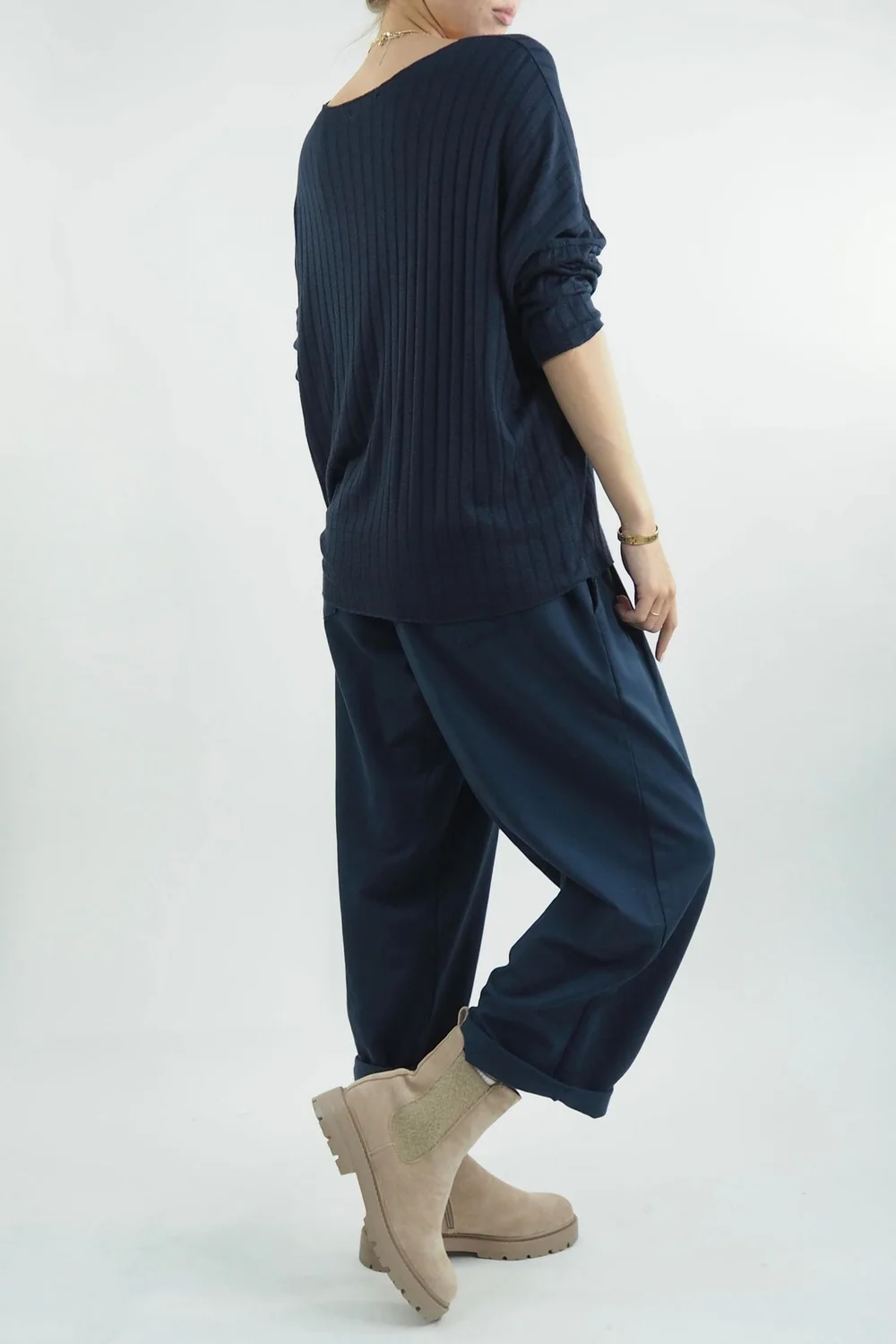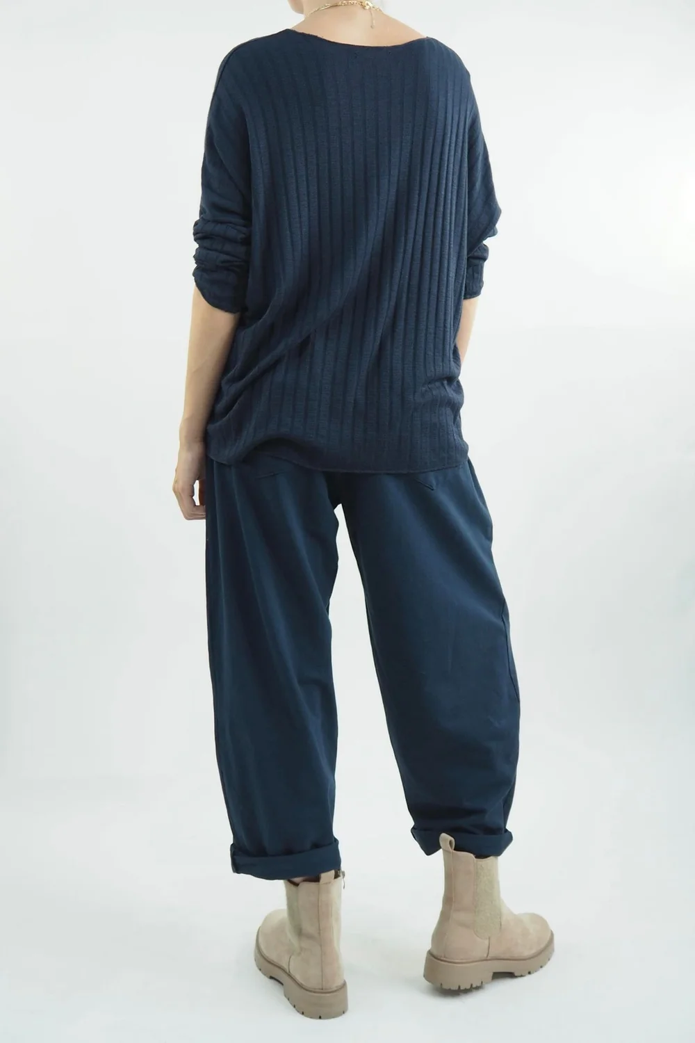 Indulge in the luxurious embrace of our Made in Italy Classic Super Soft Ribbed Fine Knit Top in Midnight, dark navy blue tone, a super soft, ribbed, stretch, fine knit that redefines comfort and style. Elevate your wardrobe with this wardrobe staple that seamlessly combines coziness and sophistication. It’s the perfect choice for those who demand both comfort and style in their daily wear.