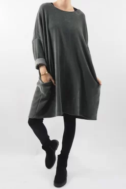 Our Dusk Sac Tunic in Khaki, green tone, from Made in Italy Clothing: the epitome of everyday comfort and style. Crafted for those who demand both functionality and fashion in their daily attire, this tunic effortlessly marries versatility with a touch of effortless chic. The soft, stretchy needle cord fabric caresses your skin, providing all-day comfort, while the sac shape offers a relaxed and flattering silhouette for all body types. This tunic pairs seamlessly with our Cosy Leg Leggings. Elevate your everyday look with this must-have piece that’s both timeless and trendsetting, a testament to the fusion of comfort and style.