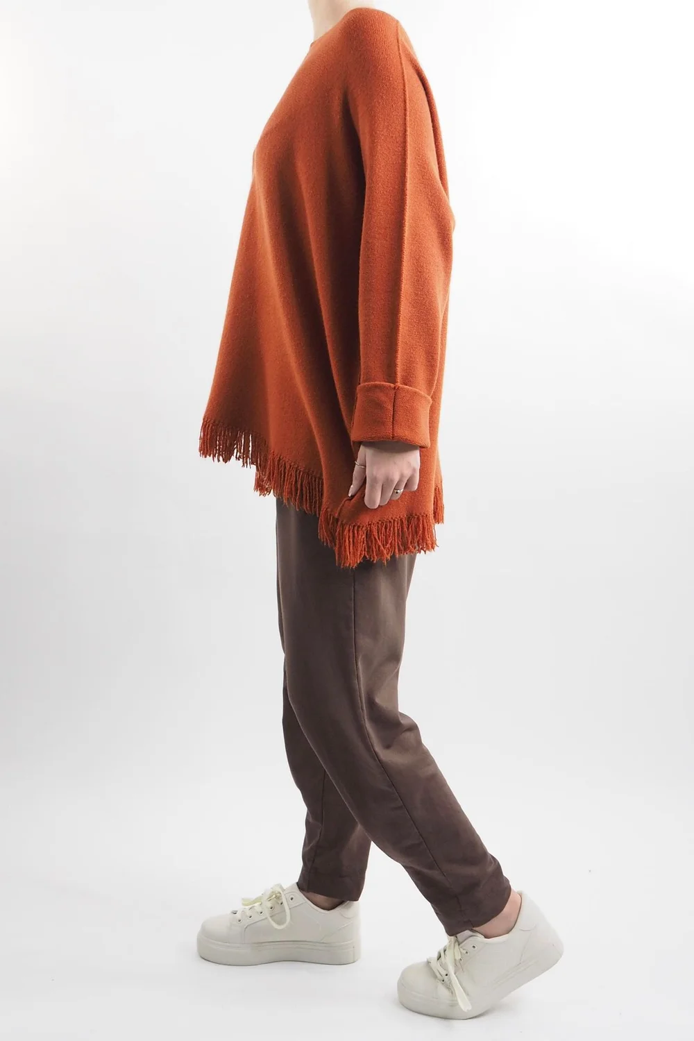 Step into autumn in style with our latest must-have: the Made in Italy Halo Fringe Box Knit Top in Saffron orange tone. This cosy yet chic piece is the perfect companion for a leisurely autumn walk. Its sumptuous fabric envelops you in comfort, while the fringe knit detail adds a touch of bohemian flair to your look. The tones are ideal for embracing the fall season, and its relaxed boxy silhouette ensures both fashion and function. Layer it over your favourite skinny pant or pair with a cocoon pant for an effortlessly on-trend autumn ensemble. Stay cosy and fashion-forward with this statement piece, and let the leaves fall as you walk in style.