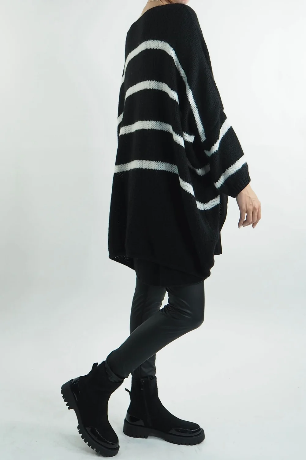 Rebellious Edge Meets Cozy Comfort: the Made in Italy Hush Breton Grunge Knit Top Black. This grunge-inspired knit effortlessly merges edgy aesthetics with undeniable comfort. The toast, tan backdrop sets the stage for the strikingly bold white stripe design. Crafted meticulously, the distressed detailing on the hemline and cuffs adds a raw, authentic touch. Whether layered over a layering vest and paired with our pesca leggings, this knit is a testament to individuality and style, making it a must-have for those who dare to defy conventions while staying snug in style.