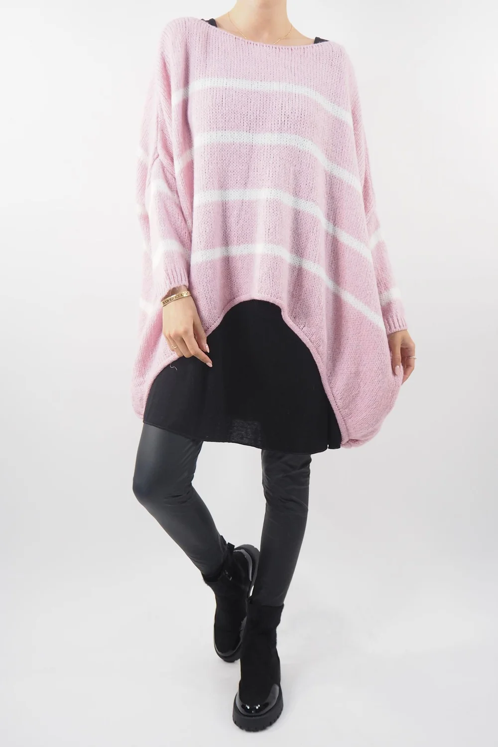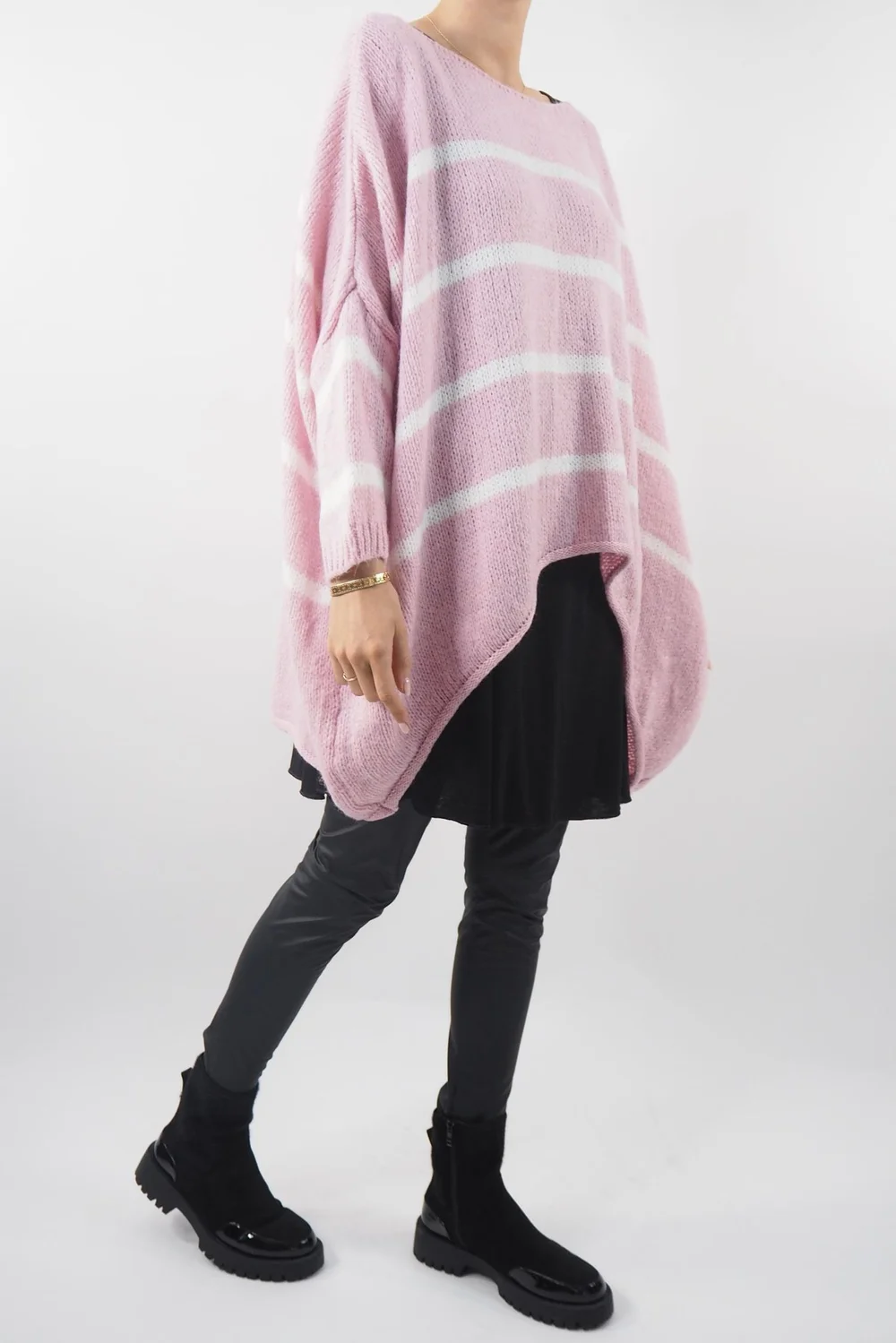 Rebellious Edge Meets Cozy Comfort: the Made in Italy Hush Breton Grunge Knit Top Rose Pink Tone. This grunge-inspired knit effortlessly merges edgy aesthetics with undeniable comfort. The rose pink backdrop sets the stage for the strikingly bold white stripe design. Crafted meticulously, the distressed detailing on the hemline and cuffs adds a raw, authentic touch. Whether layered over a layering vest and paired with our pesca leggings, this knit is a testament to individuality and style, making it a must-have for those who dare to defy conventions while staying snug in style.