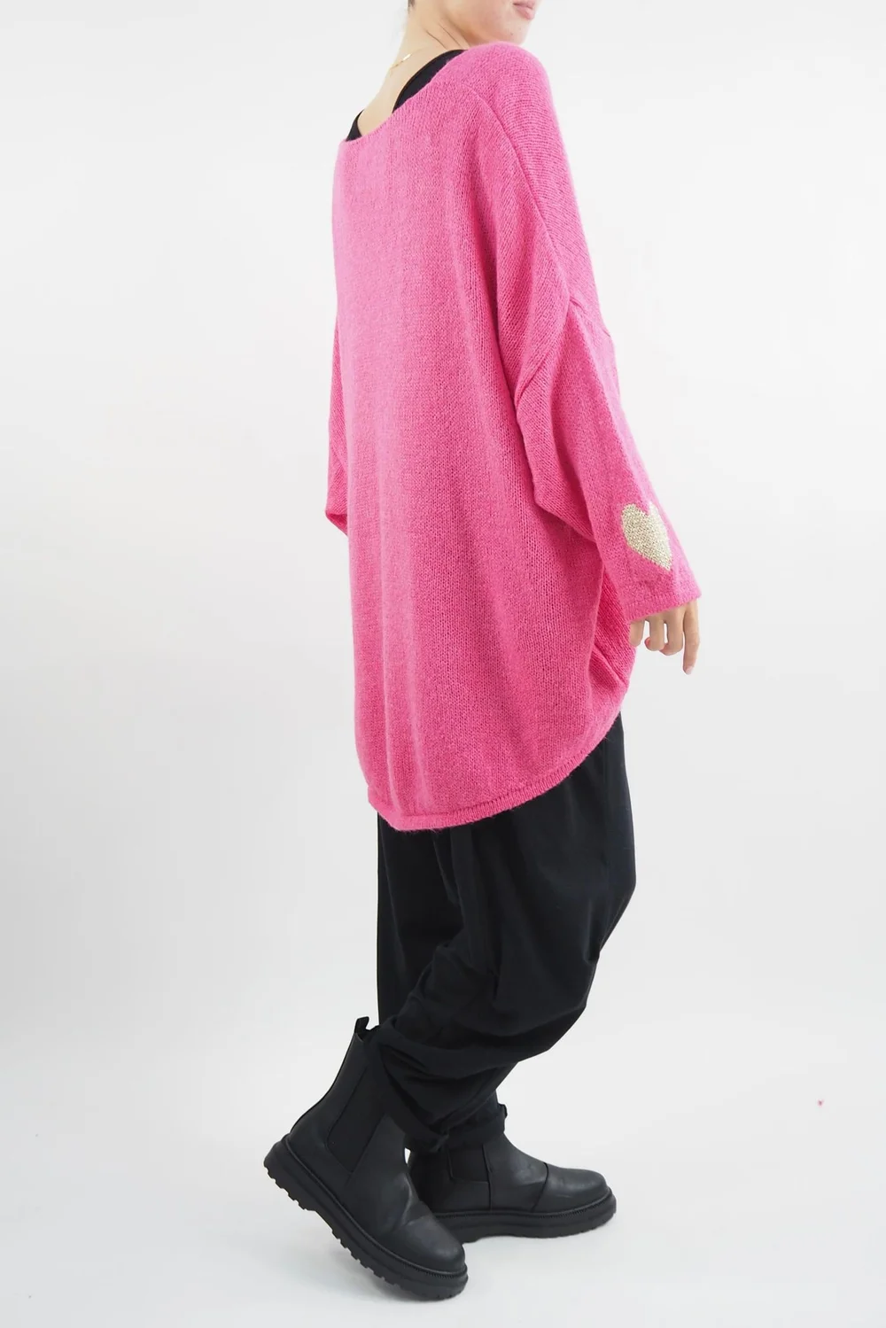 Elevate your autumn style with the epitome of luxury and warmth: the Made in Italy Hush Heart of Gold Knit in Hot Pink with Gold Heart Detail. This exquisite piece effortlessly combines comfort and opulence, making it an absolute must-have for the upcoming season.