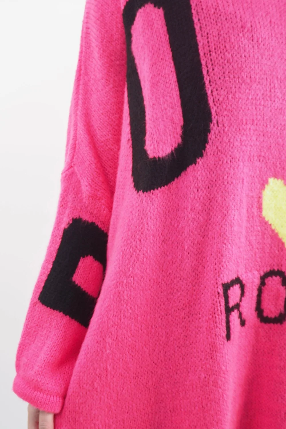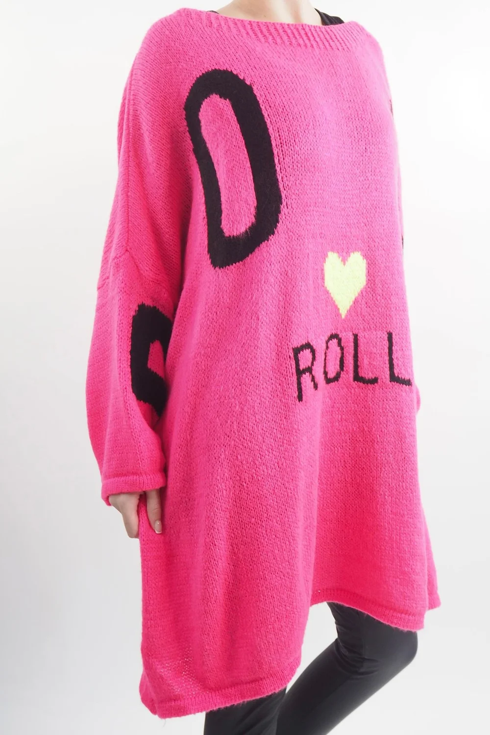 Elevate your autumn style with the luxury and warmth: the Made in Italy Hush Rock n Roll Knit Top in Pink, pink tone with contrasting Rock n Roll and heart design. This exquisite piece effortlessly combines comfort and opulence, making it an absolute must-have for the upcoming season.