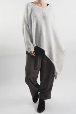 Introducing the ultimate embodiment of edgy comfort: the Made in Italy Hush Super Slant Knit in Stone, beige cream tone, is a must have jumper in your autumn winter wardrobe. This avant-garde piece effortlessly merges the nostalgia of ’90s grunge with contemporary chic. Crafted from sumptuously soft knit fabric, it drapes like a dream, enveloping you in a cocoon of warmth and style. Whether paired with a pair of our Apres Skinny Dart Joggers or Bodhi Tuck Cocoon Pants or layered over a classic Parachute or Cocoon Dress, this jumper is the epitome of laid-back cool, inviting you to embrace the raw, unapologetic essence of grunge while staying impeccably snug and stylish. It’s time to cozy up to the season’s most coveted knitwear sensation.