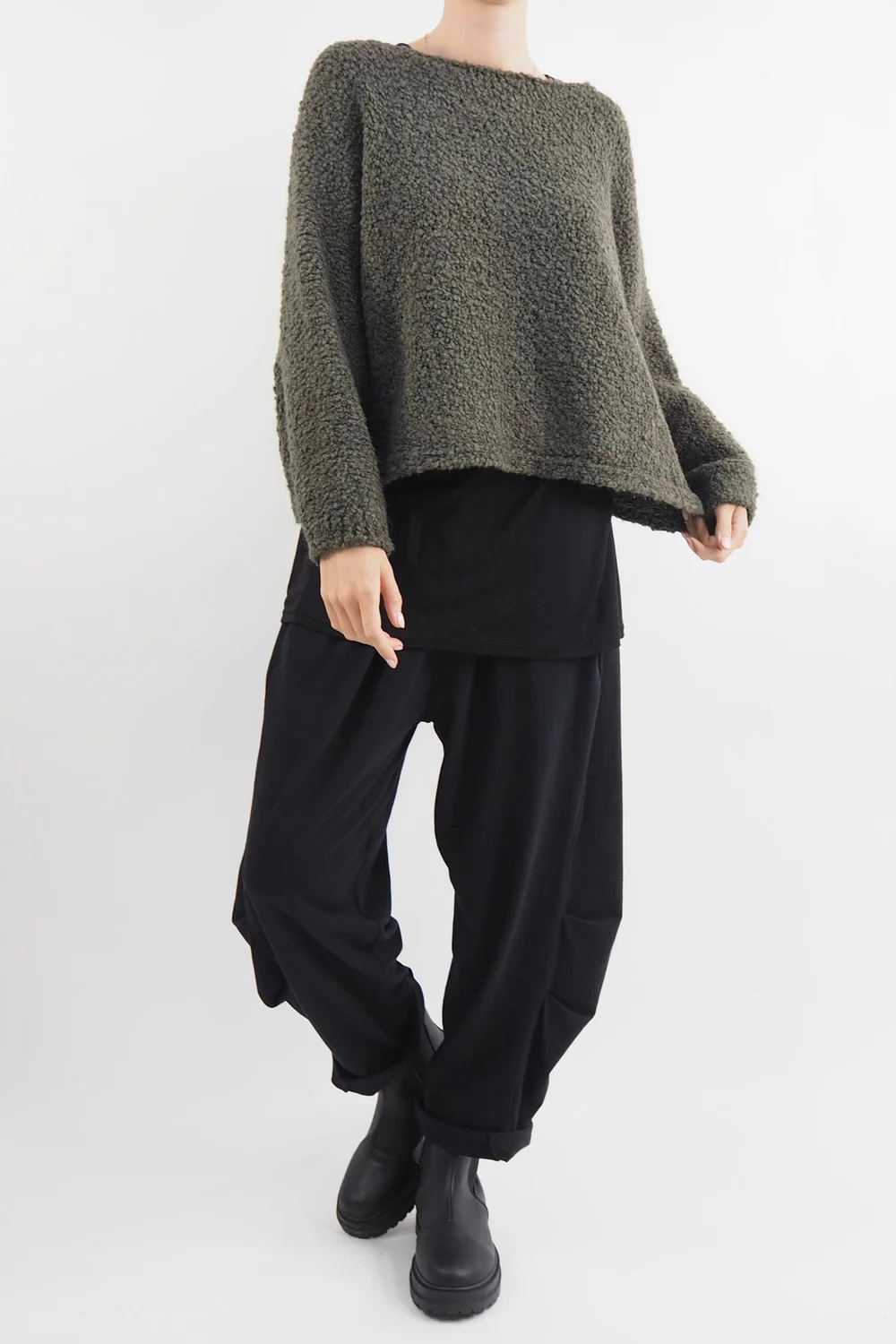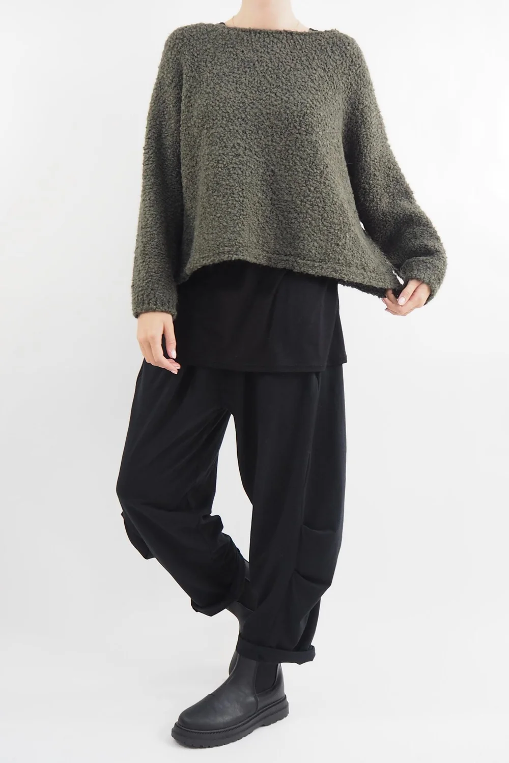 Experience the epitome of comfort and luxury with our Made in Italy Hygge Boucle Knit Top in Bonsai green tone. Meticulously crafted using traditional techniques and the finest Italian materials, this knitwear embodies the essence of coziness and relaxation. The unique boucle texture not only adds a tactile charm but also offers an extra layer of warmth. Whether you’re lounging at home or stepping out on a chilly day, the Hygge Boucle Knit wraps you in a sense of well-being and timeless elegance, bringing a touch of Italian craftsmanship and hygge-inspired comfort to your wardrobe. This knit was made to be worn over the Hygge Kick Falre Co-ord.