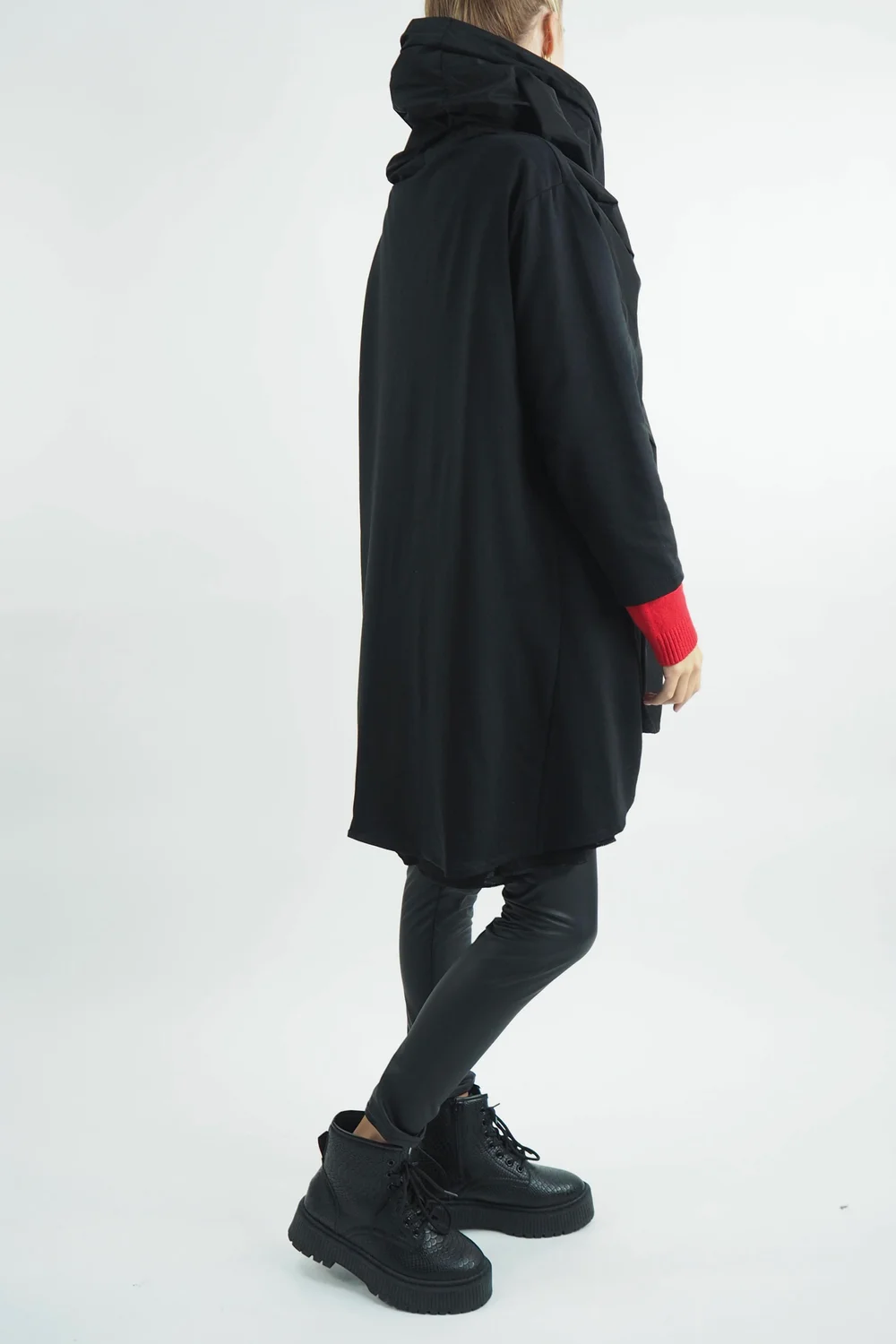 The Made in Italy Moxie Haru Swing Zip Hoodie Jacket in Classic Black : Step into the realm of dark allure with this mesmerizing black hooded jacket that exudes a sense of edgy sophistication. Its dramatic drape hooded neck detail adds a touch of avant-garde flair, while the silver hardware creates a captivating silhouette that demands attention. Did we mention it has pockets. Perfect for a night on the town or a high-profile event, this dress is a statement piece that will have heads turning. Style with our Laundry b Richmond 72 boot and a Moxie dress to finish your look!