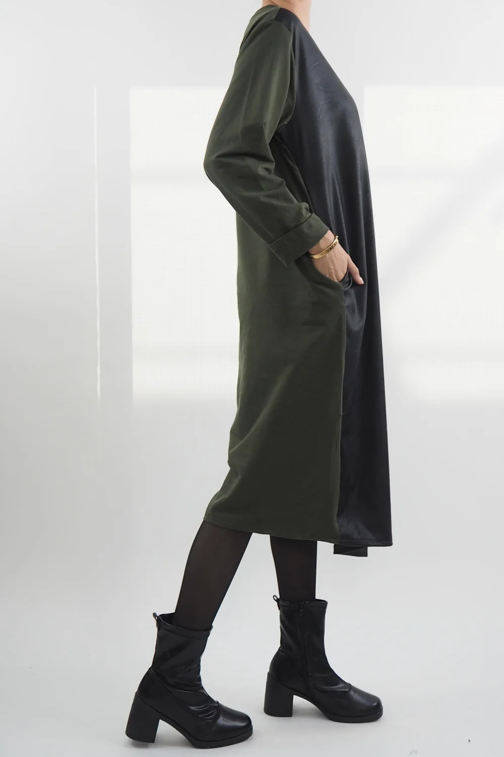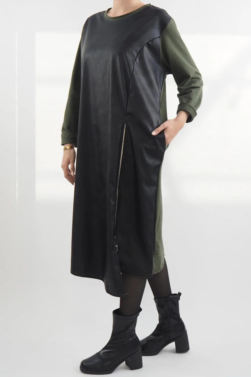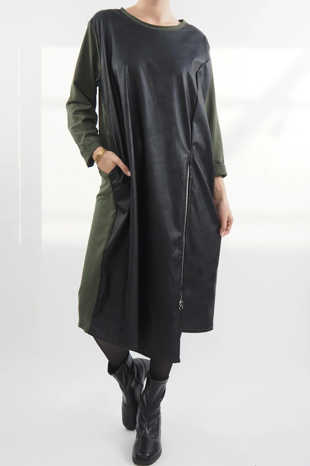 The Made in Italy Moxie Pesca Zippy Dress in Bonsai, khaki green tone: the epitome of fierce fashion an edgy tunic dress with a leather-look front panel and a sultry stretch jersey back. The leather-look front panel exudes a sense of rebellious confidence, while the supple stretch jersey back ensures maximum comfort and flexibility. But what truly sets this dress apart is the electrifying eye-catching zip detail adorning the front.Â