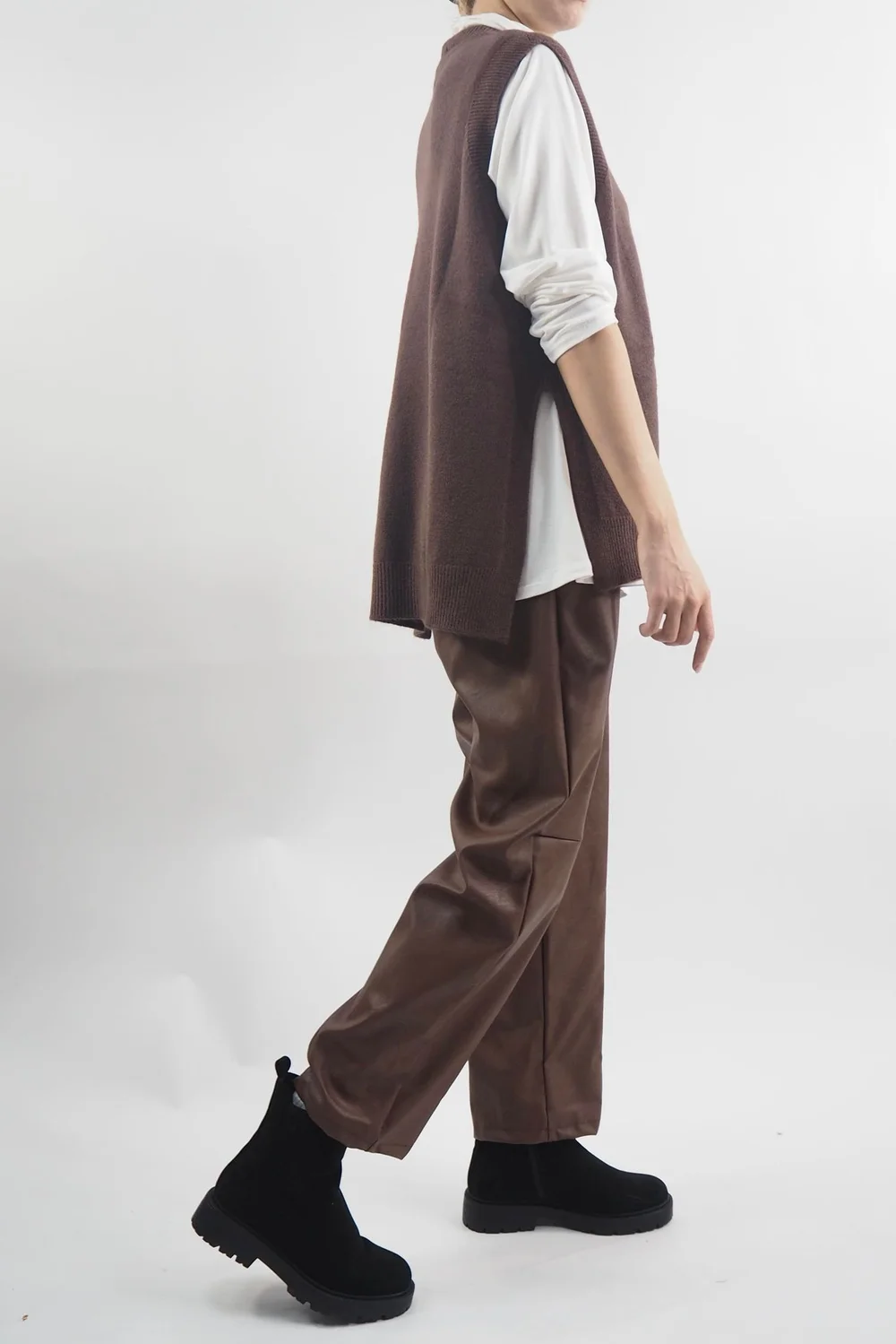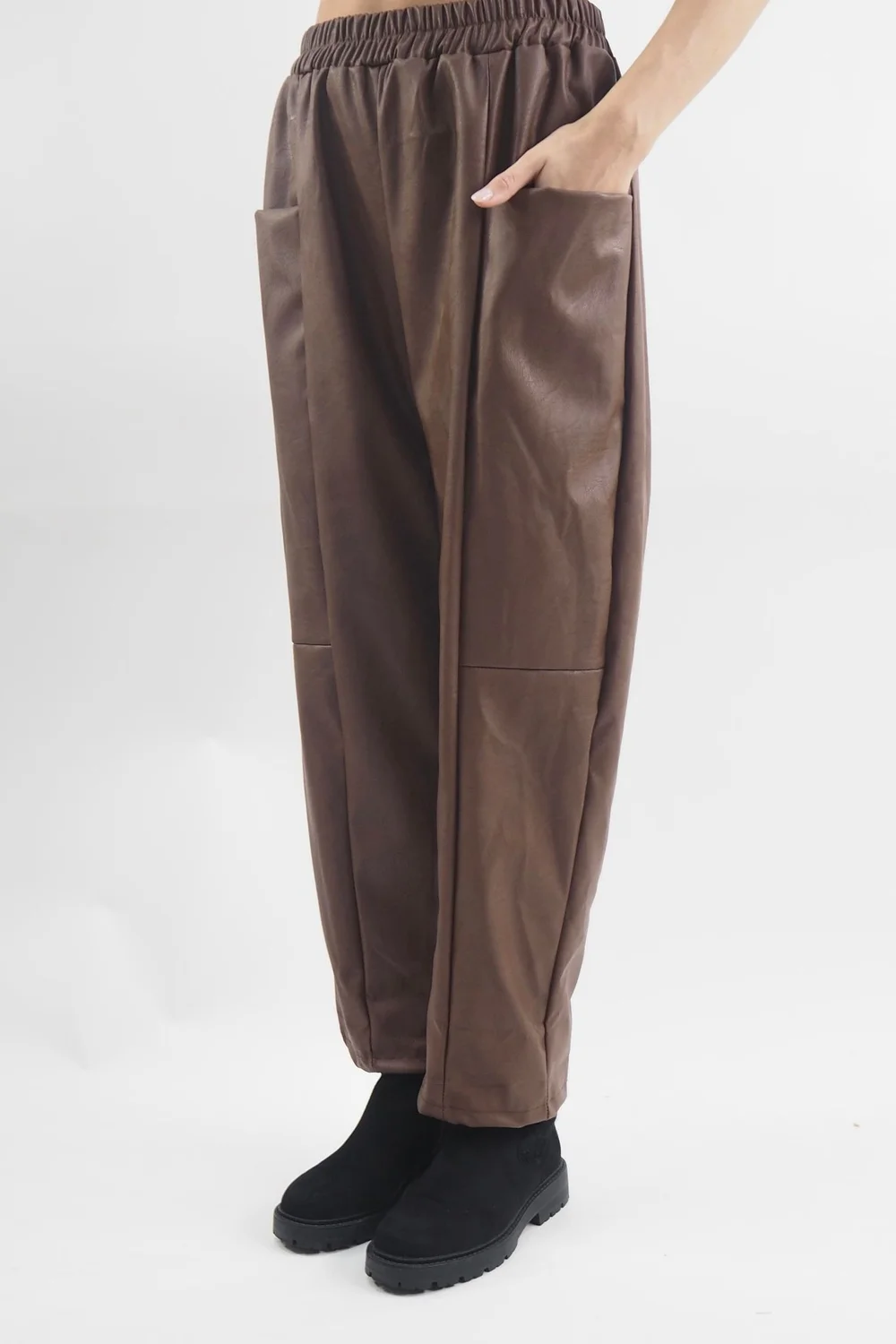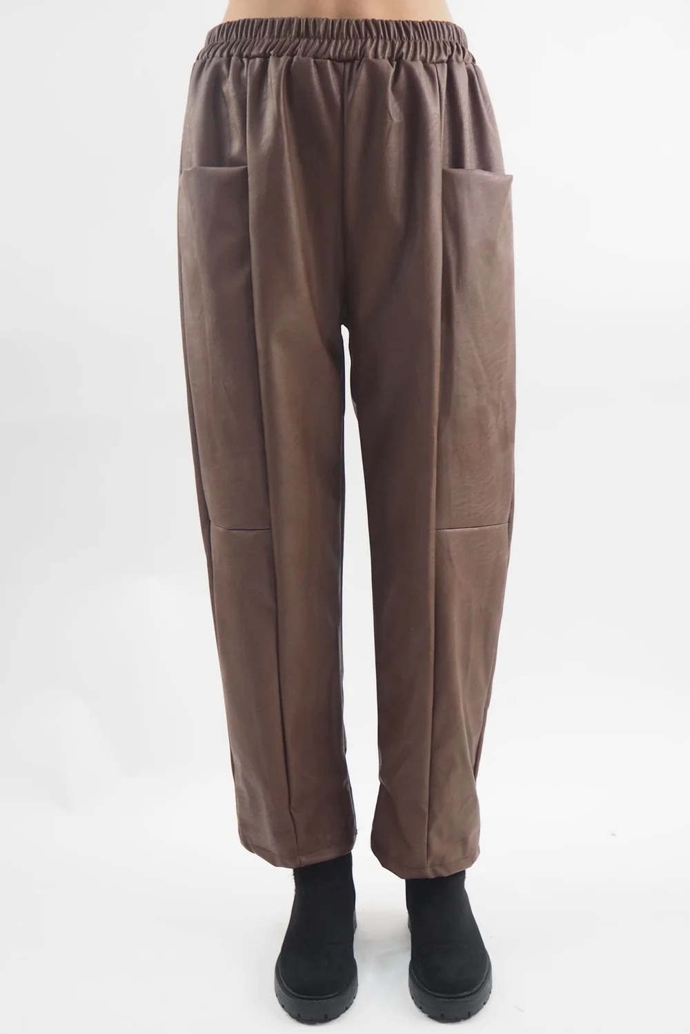The Made in Italy Pesca Leather Look Deep Pocket Pant in Chestnut, brown tone: the epitome of modern chic: a pair of edgy straight-leg leather-look trousers that effortlessly blur the lines between sophistication and casual cool. The leather-like fabric exudes a bold attitude, offering a luxurious feel. What sets these trousers apart is their deep pocket detailing, adding a utilitarian edge while ensuring practicality and style go hand in hand. Whether you’re aiming for a polished, office-ready ensemble or a laid-back, off-duty look, these versatile trousers are your go-to choice. Style with a white shirt or fine jersy polo neck and knitwear for the perfect autumn look.