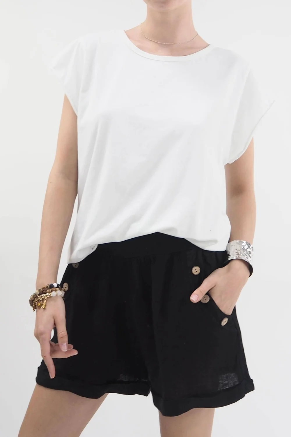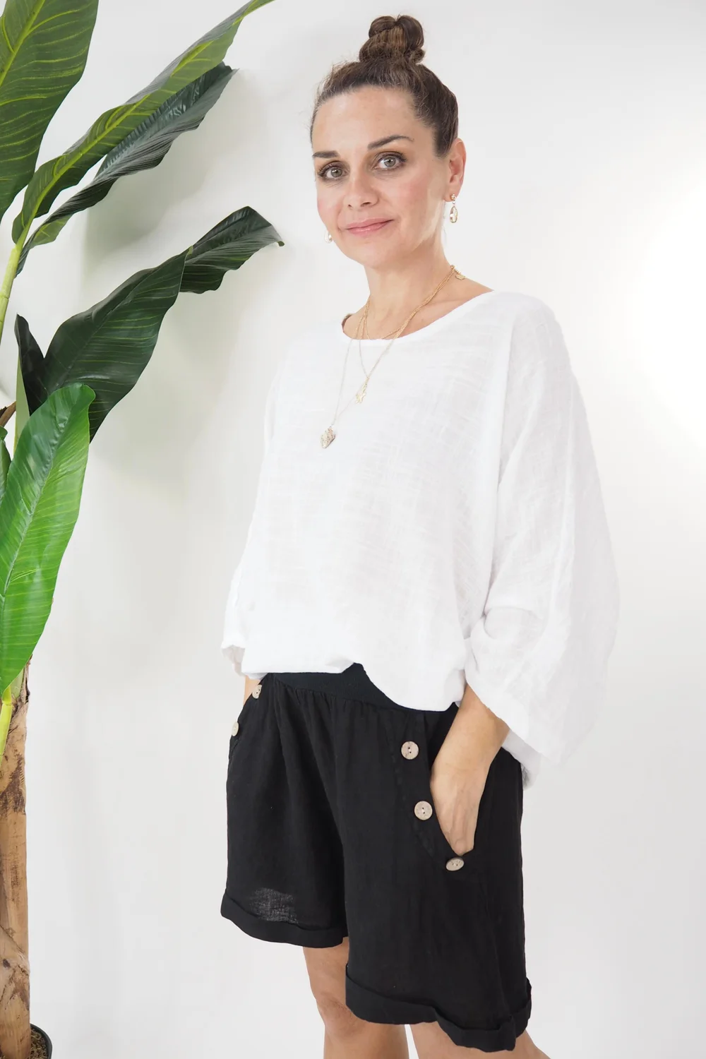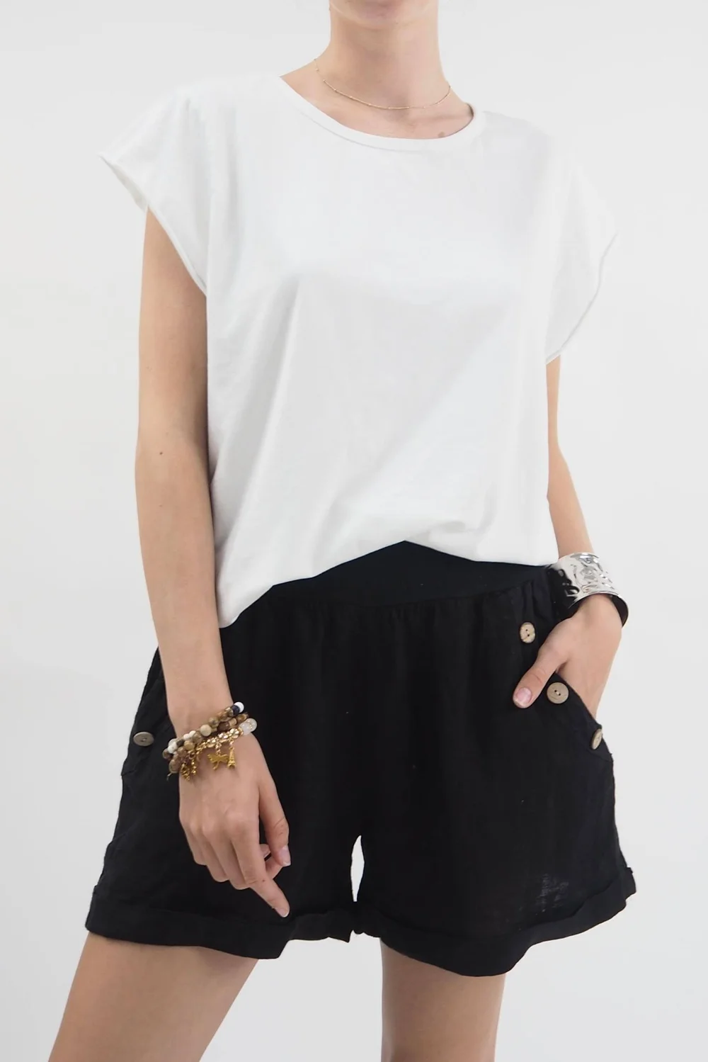 Our Made in Italy Linen shorts in black have become a staple in every Laundry B wardrobe and for good reason. Not only are they effortlessly chic, but they are also incredibly comfortable, especially when they come in a pull-on style. The soft, breathable fabric of linen allows for a breezy, lightweight feel that’s perfect for the warmer months. Pair them with a fresh white top for a relaxed, yet elevated look that will take you from a day at the beach to a night out with ease. Trust us, once you slip into a pair of our Pure Linen Benji pull-on linen shorts, you won’t want to take them off.Â