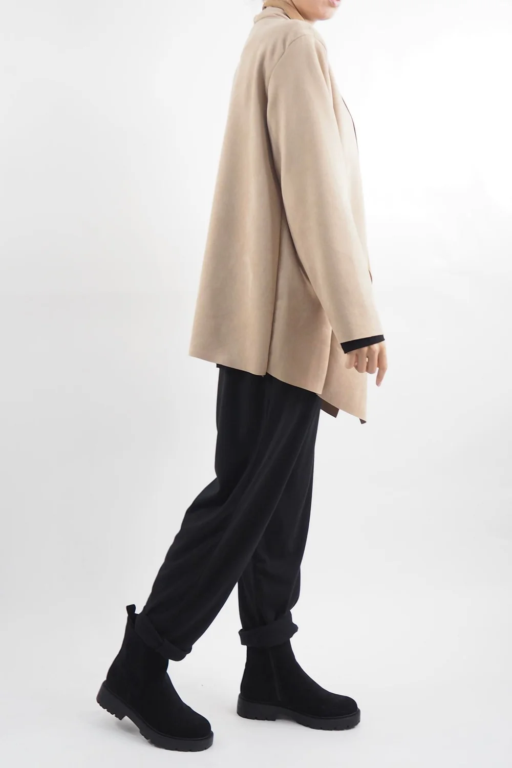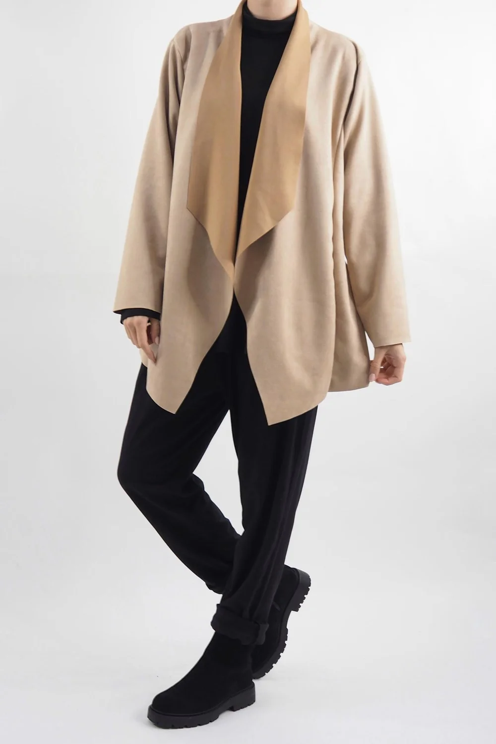 The Made in Italy Sander Moleskin Touch Waterfall Blazer in Nude beige tones, these jackets are a dream come true, combining the luxurious look of moleskin with the cruelty-free appeal of faux leather. With the waterfall vibe, these jackets are the epitome of cool confidence, effortlessly elevating any outfit to new heights. The faux moleskin material not only adds a touch of opulence but also provides a velvety softness that feels like a dream against the skin. The drawstring waist gives shape and flatters all body types, making a strong statement wherever you go.