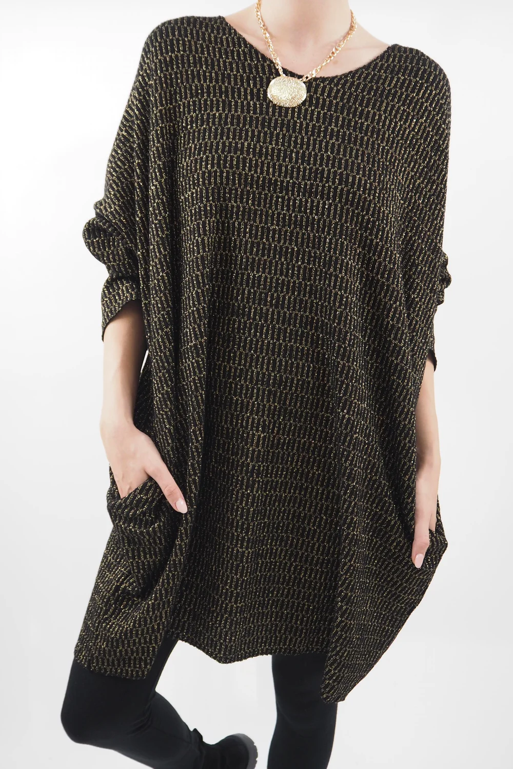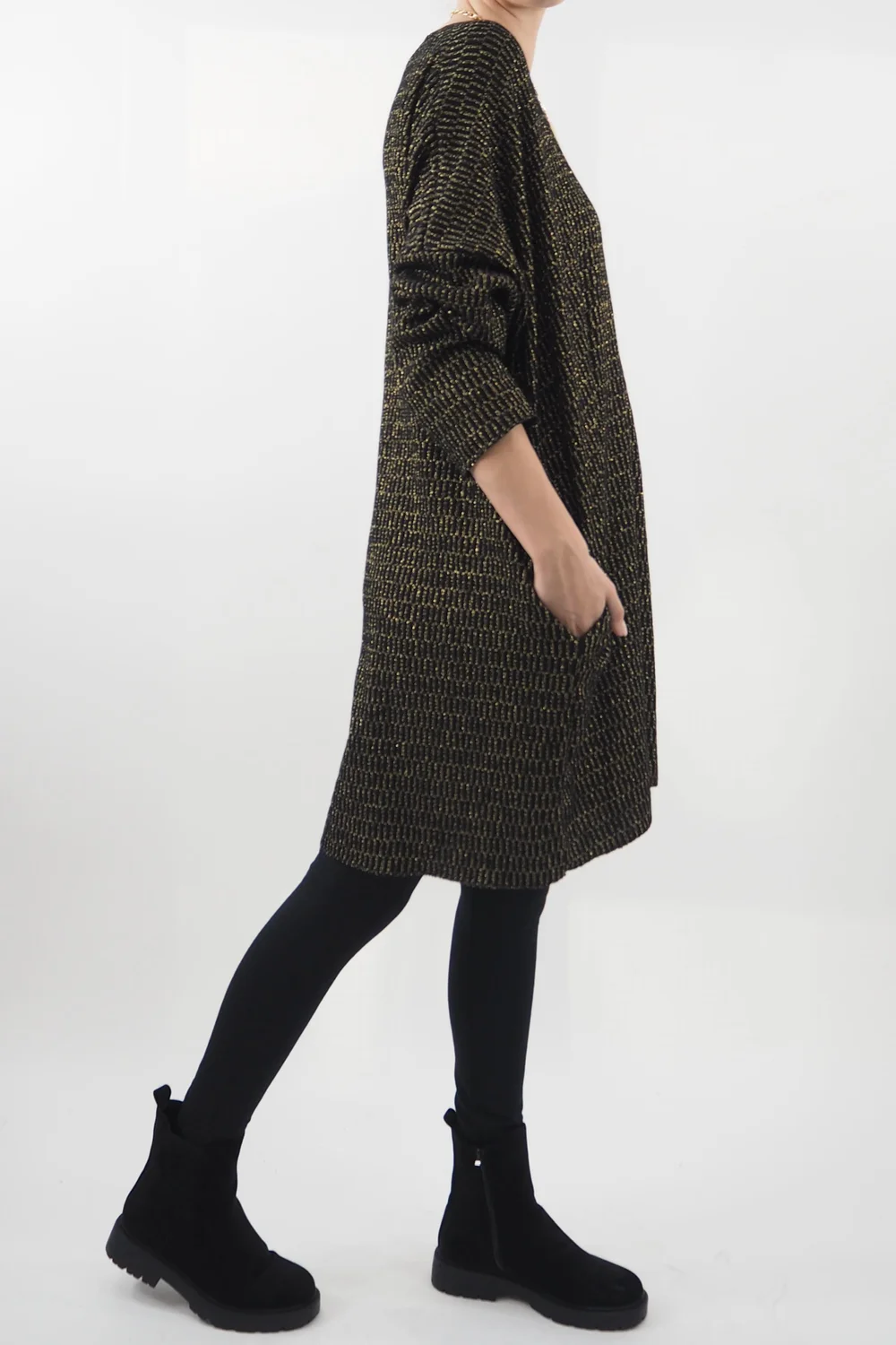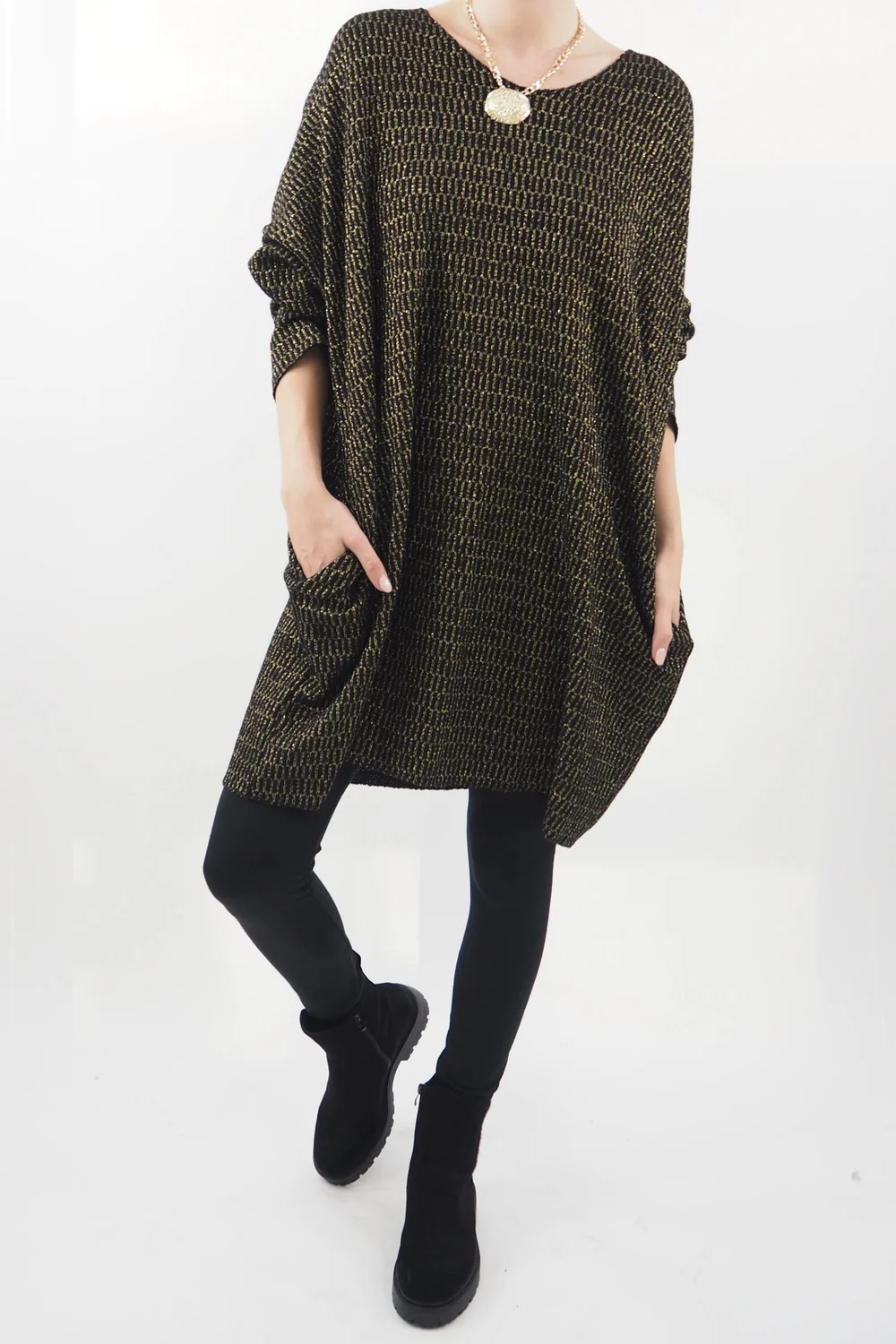 Introducing the epitome of versatile fashion: the Made in Italy Shimmer Me Softly Dress in Black.Ā This enchanting garment effortlessly bridges the gap between everyday chic and party season glamour.Ā Crafted with a shimmering lurex thread, it exudes a subtle sparkle, making it a standout choice for both casual strolls and festive soirees.Ā Its comfortable shift silhouette ensures a flattering fit while maintaining a relaxed feel, perfect for all-day wear. Style with tights and Kensington 72’s or Cosy Legs and Chunky Boots.