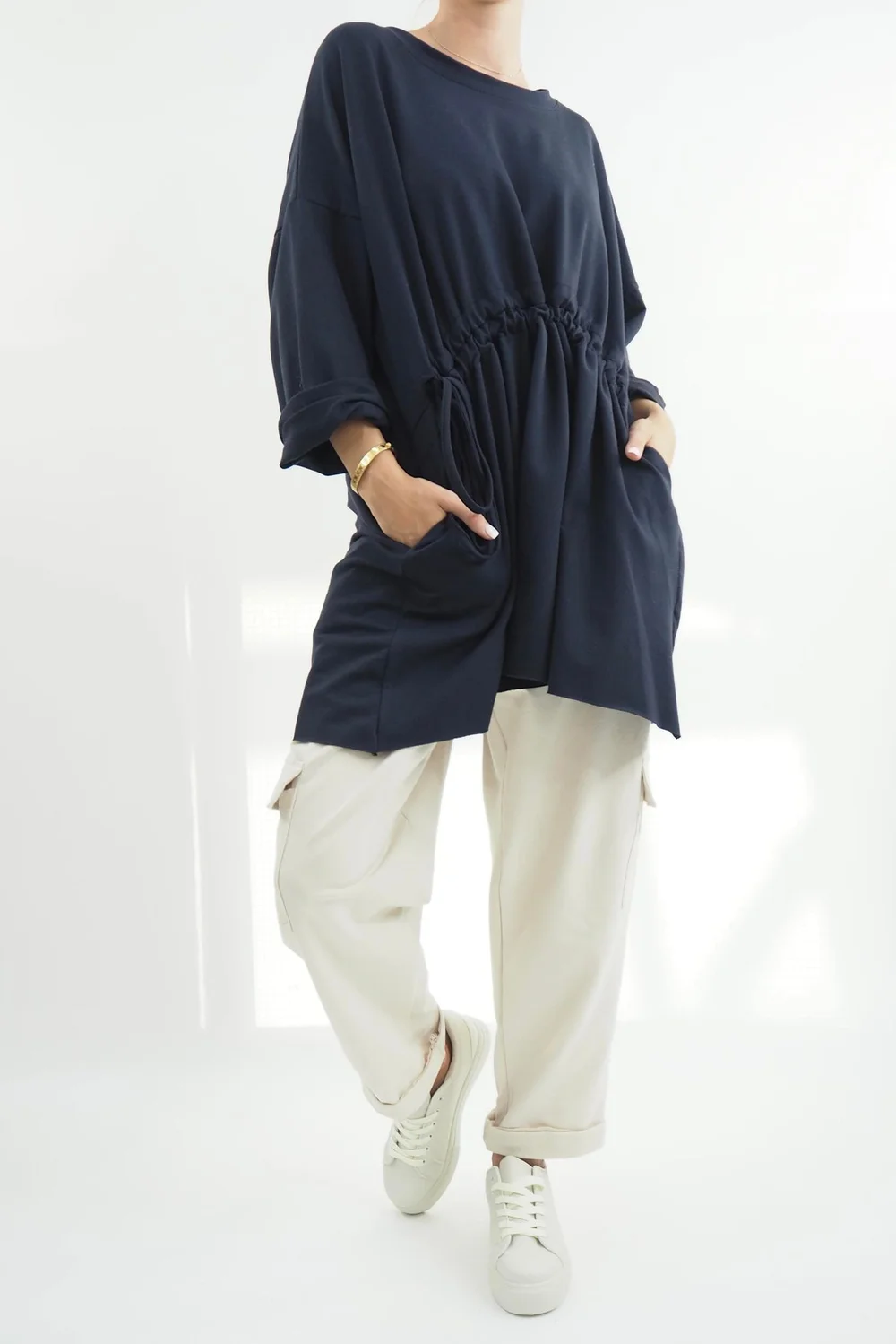 A timeless masterpiece: add our Made in Italy Tali Pull Tie Top in Ink, deep navy blue tone, to your wardrobe. Comfort and sophistication, this garment transcends the ordinary with it’s adjustable pull-tie detail. Crafted from the purest cotton. Style with our Made in Italy Tali Cargo Joggers or Lagenlook Classic Cocoon Pants for the perfect look.