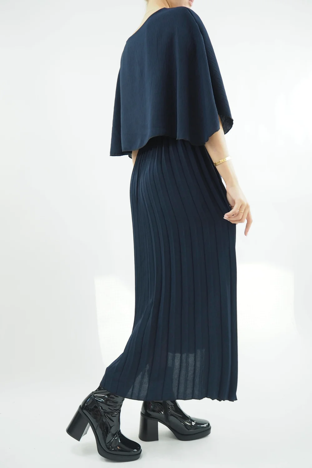 Elegance meets sophistication with: the Made in Italy Zeta Cape Dress in Ink blue tone with a captivating cape design. This fashion masterpiece is the embodiment of timeless grace, making it an ideal choice for any occasion that demands a touch of sophistication and comfort. The pleated skirt gracefully cascades to the floor, creating a flowing silhouette that exudes grace with every step. The cape design top adds a dash of drama, effortlessly draping over the shoulders, making a bold yet graceful statement. Whether you’re attending a glamorous party or a romantic dinner under the stars, this dress will ensure you steal the spotlight with your impeccable style. Elevate your fashion game and embrace the allure of this pleated maxi dress – it’s your ticket to being the belle of any ball.