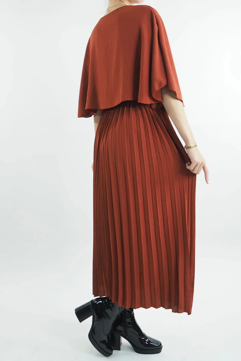 Elegance meets sophistication with: the Made in Italy Zeta Cape Dress in Saffron rust tone with a captivating cape design. This fashion masterpiece is the embodiment of timeless grace, making it an ideal choice for any occasion that demands a touch of sophistication and comfort. The pleated skirt gracefully cascades to the floor, creating a flowing silhouette that exudes grace with every step. The cape design top adds a dash of drama, effortlessly draping over the shoulders, making a bold yet graceful statement. Whether you’re attending a glamorous party or a romantic dinner under the stars, this dress will ensure you steal the spotlight with your impeccable style. Elevate your fashion game and embrace the allure of this pleated maxi dress – it’s your ticket to being the belle of any ball.