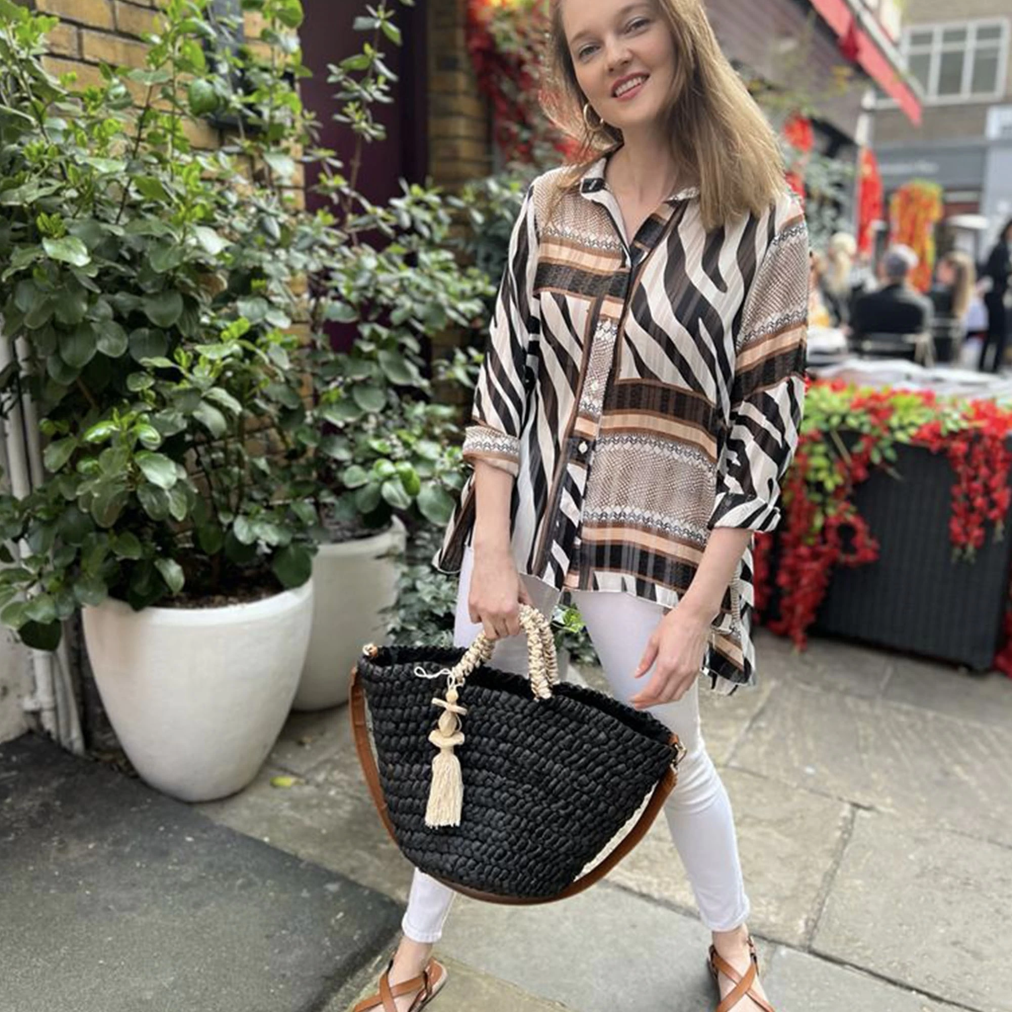 A beautiful bag for a beautiful day, handmade from 100% straw, featuring a long cross body strap if desired