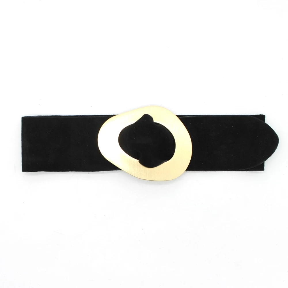 A soft suede belt that can be used for any size as it just pulls through, featuring a statement buckle