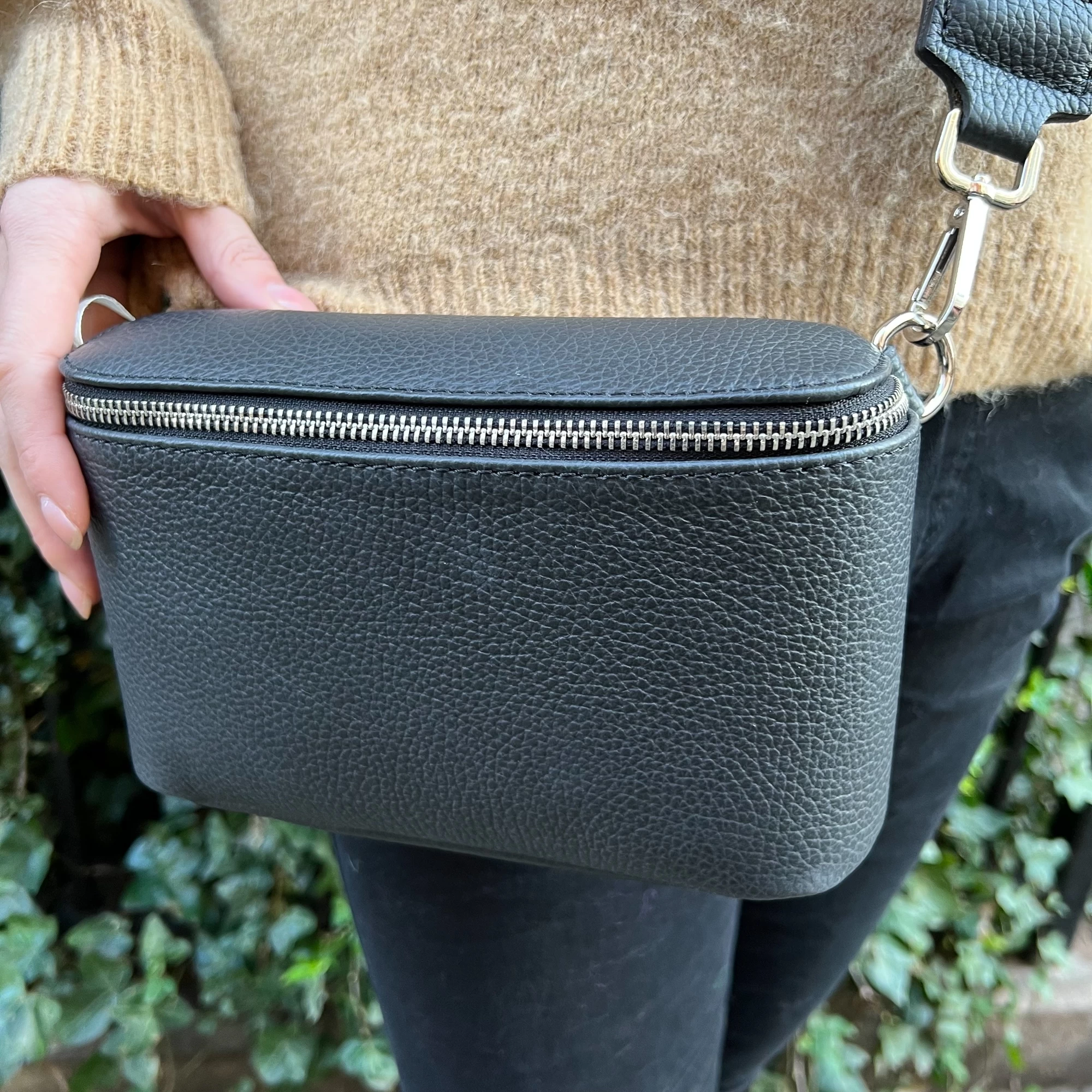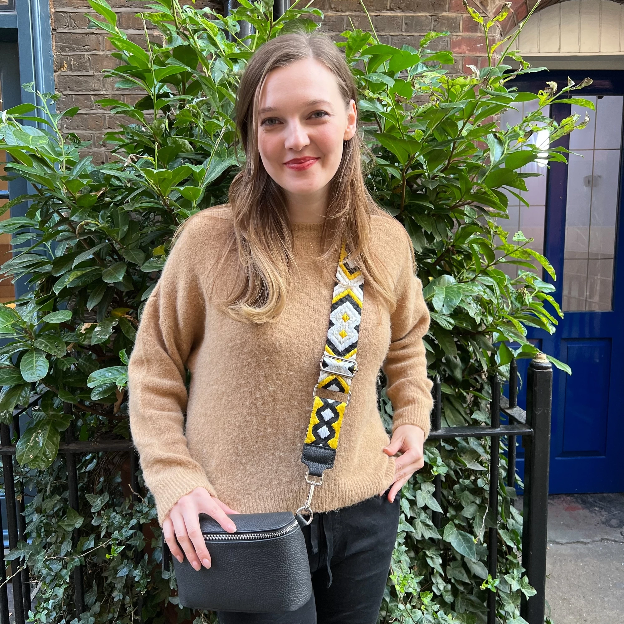A gorgeous soft touch leather cross body bag with a wide contrasted woven strap