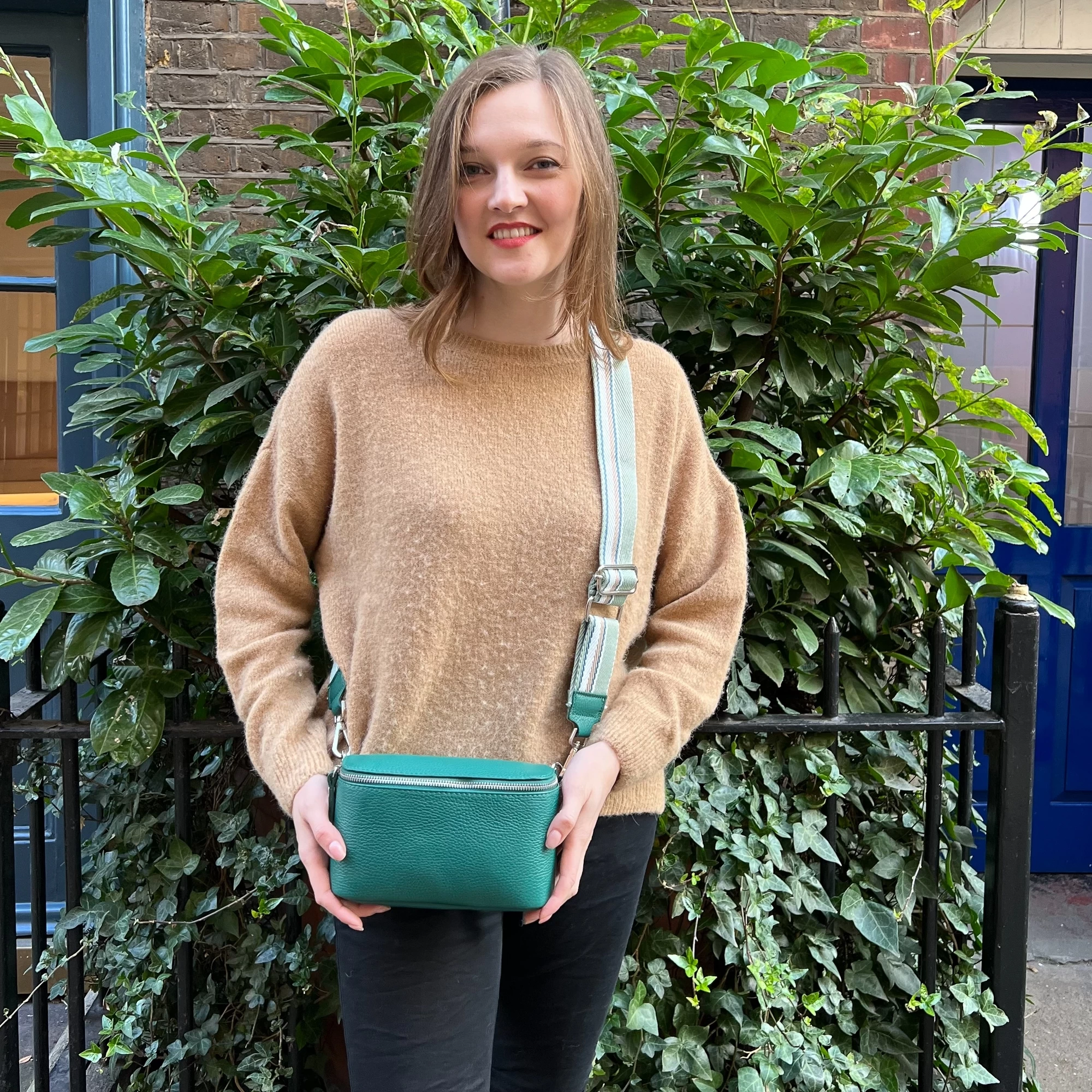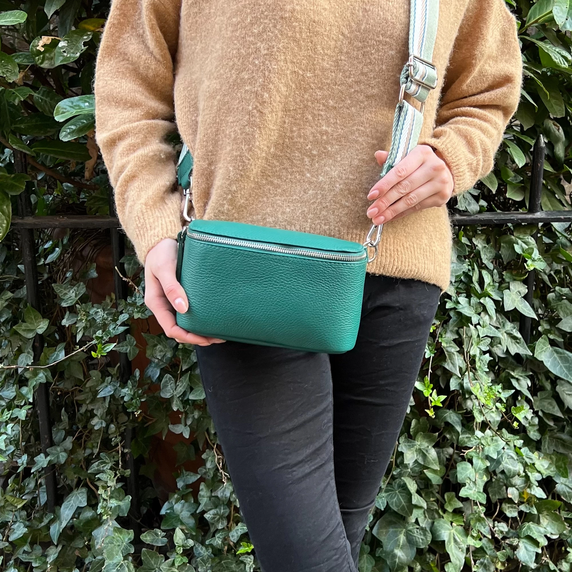 A gorgeous soft touch leather cross body bag with a wide contrasted woven strap
