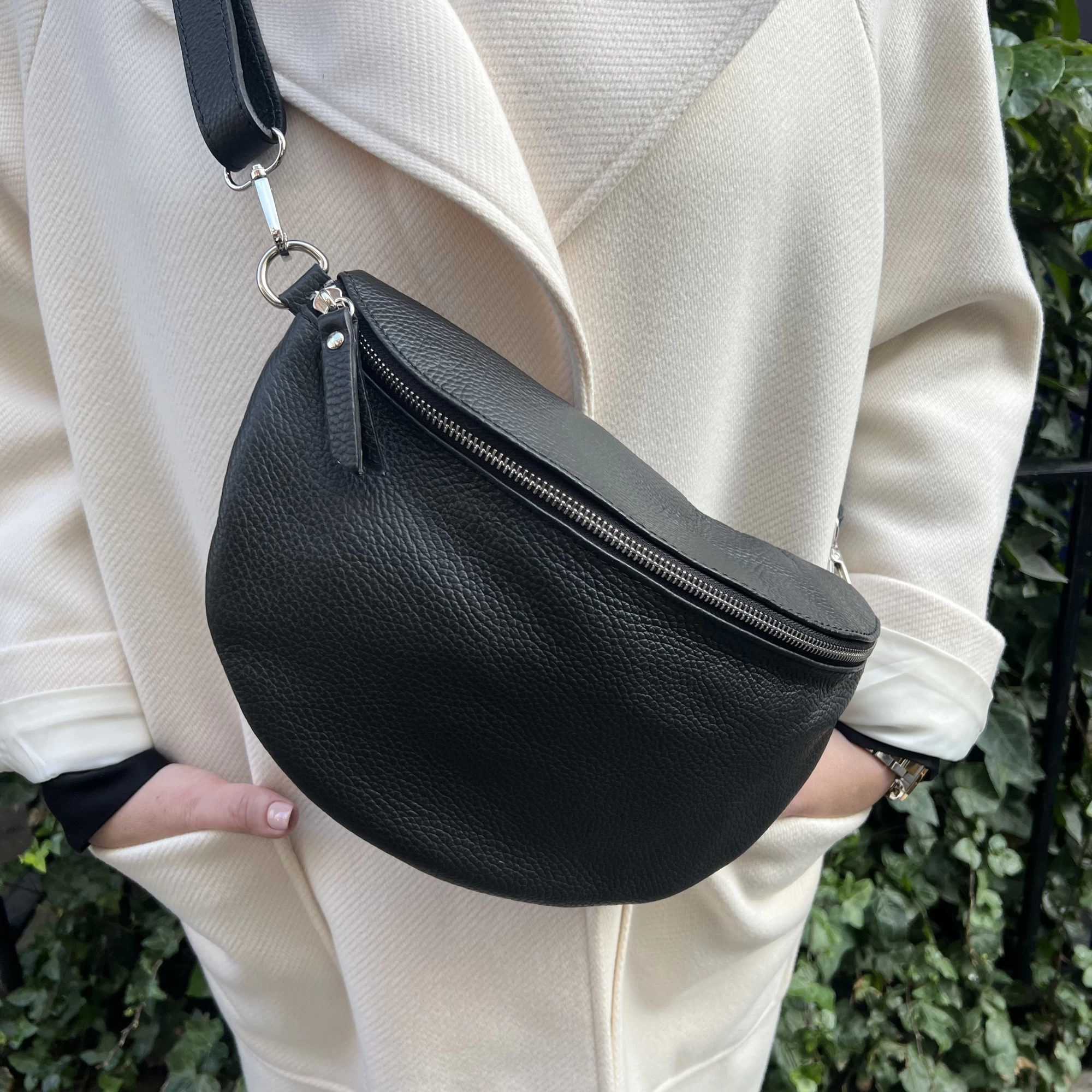 A gorgeous soft touch leather cross body pouch bag with a zip front and adjustable strap