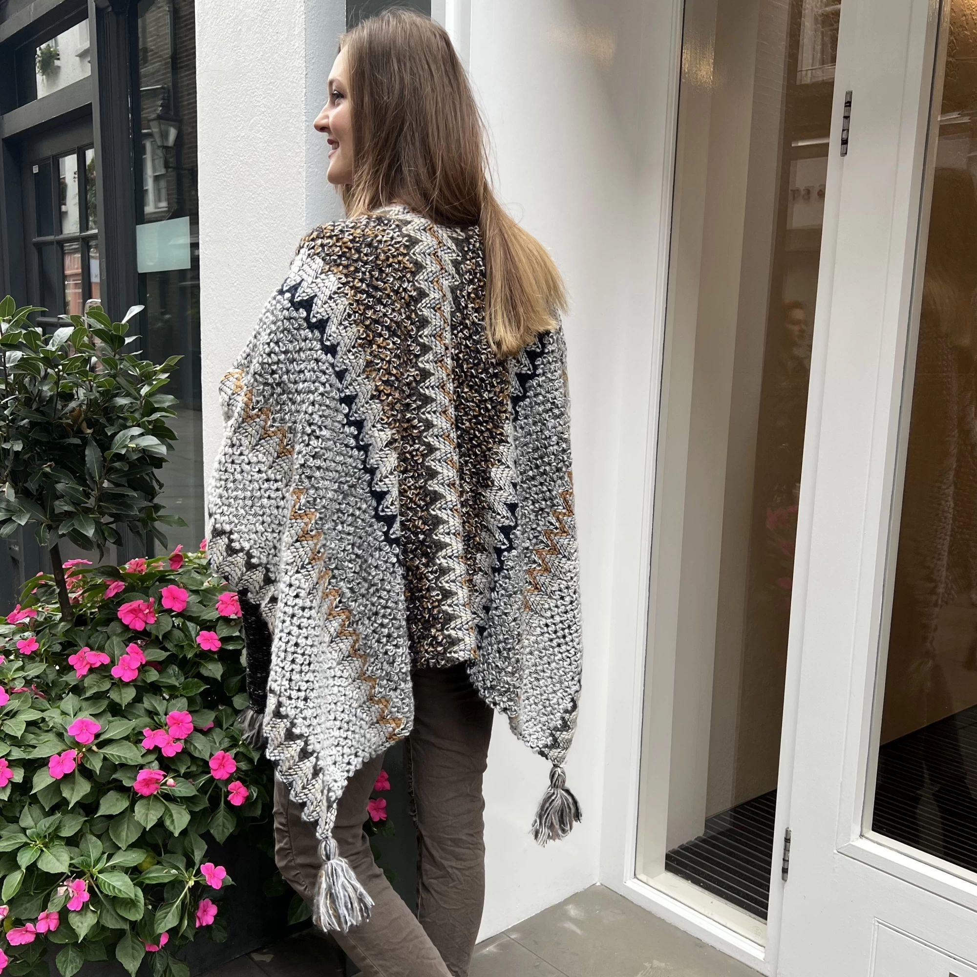 A nice multi coloured knitted shawl / wrap featuring tassle trims perfect for the cooler months, gift me, keep me, love me