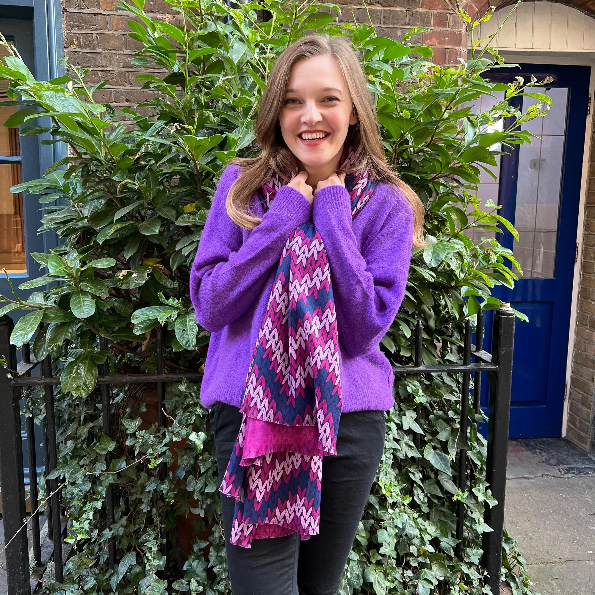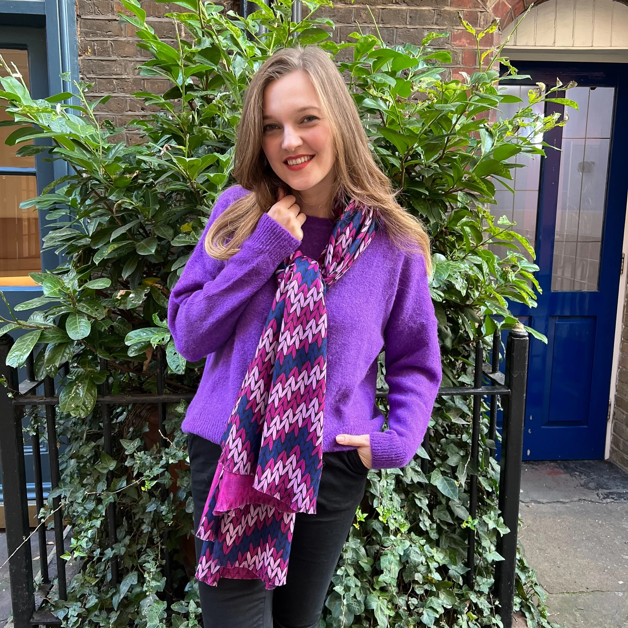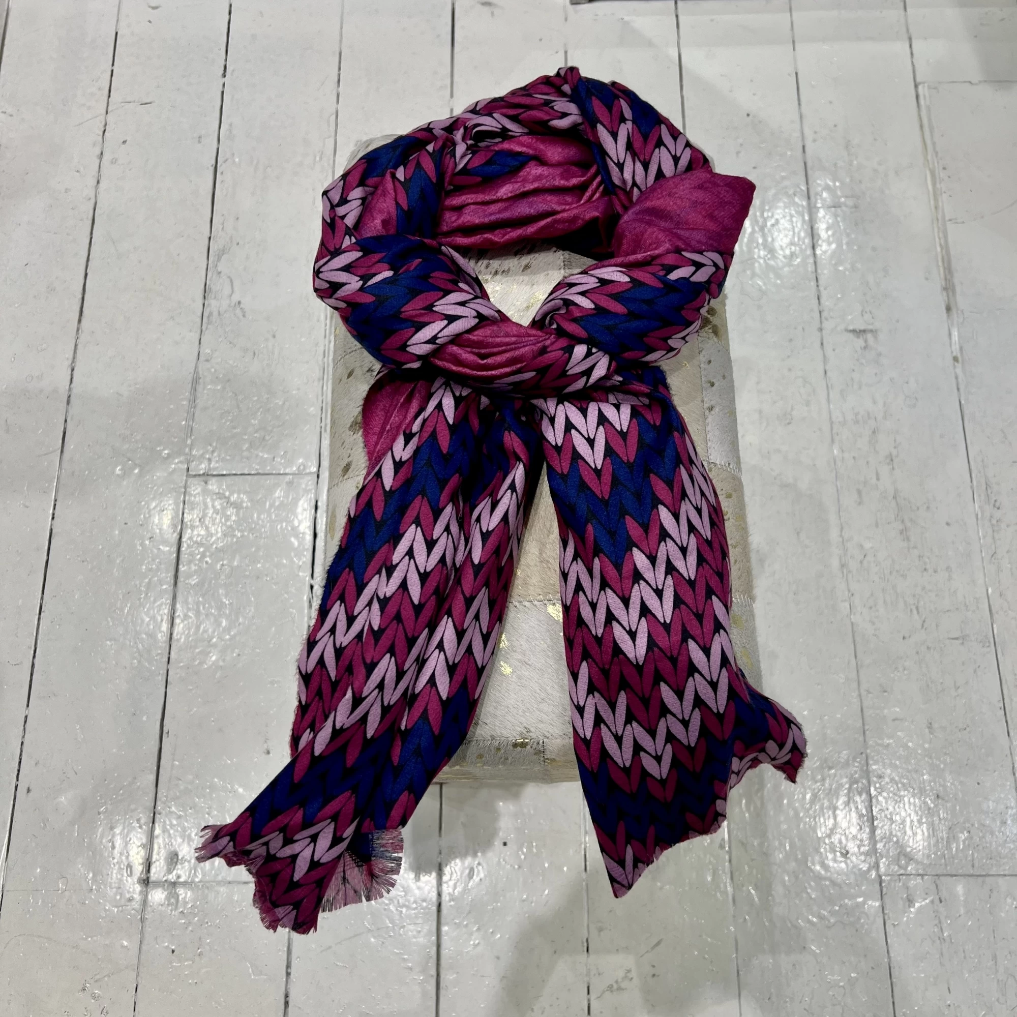 Malini Petal Fuschia Pink Wool Blend Contrast Printed Tassle Trim Scarf