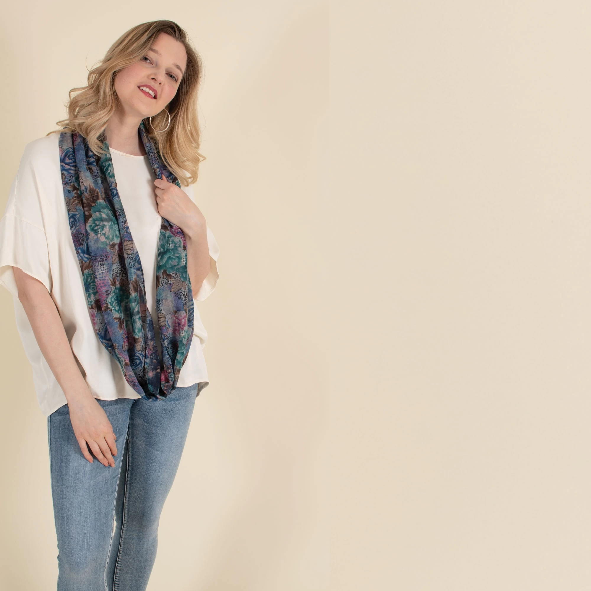 A simple scarf that is fixed as one piece like a snood, based on a woven yarn featuring a large floral print