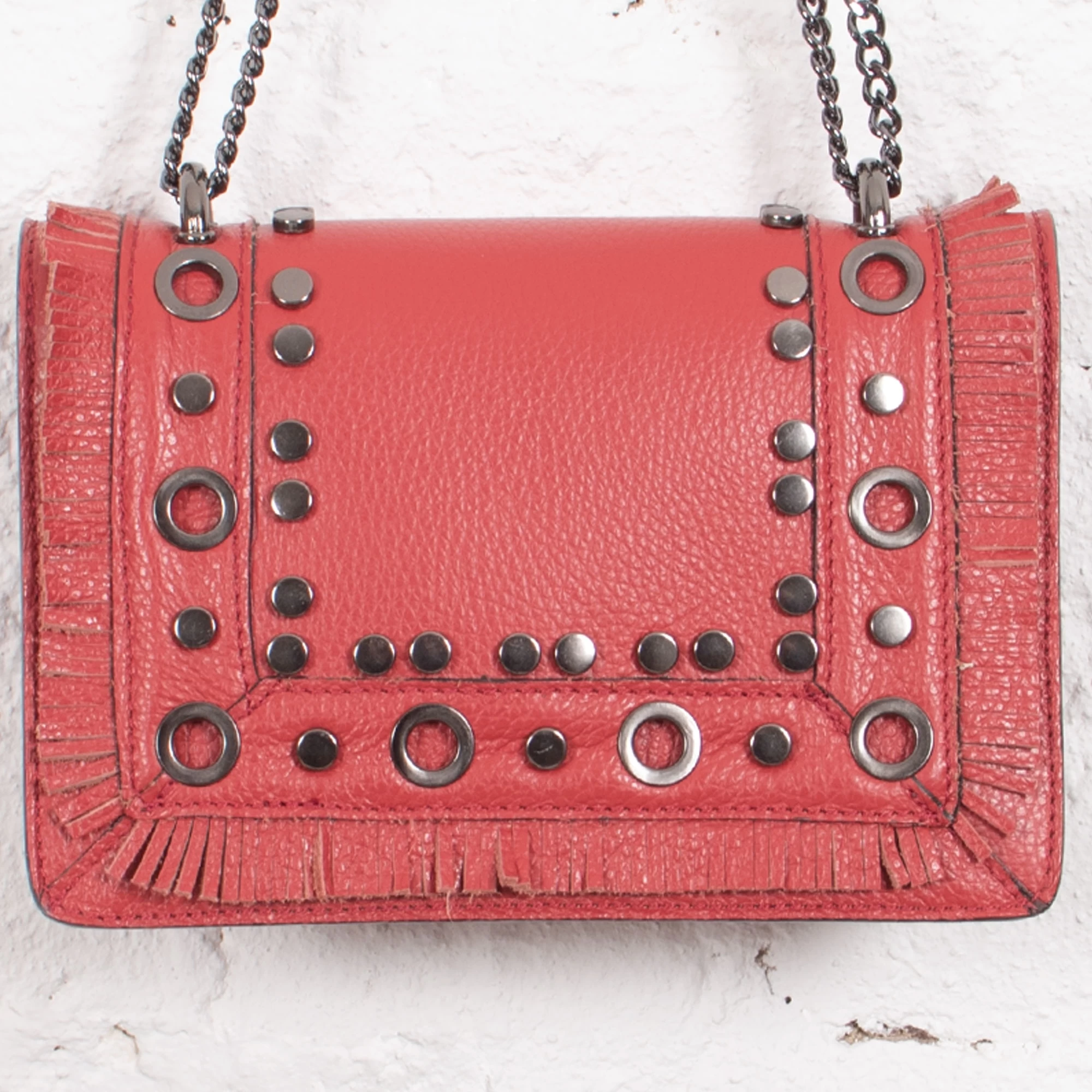 Ramona is beautifully crafted from leather, a stud and fringe detailed front and back, with a part chain strap, this bag is exquisite to use from day to night, you can wear it cross body, double shoulder strap or as a single long strap really like this bag.