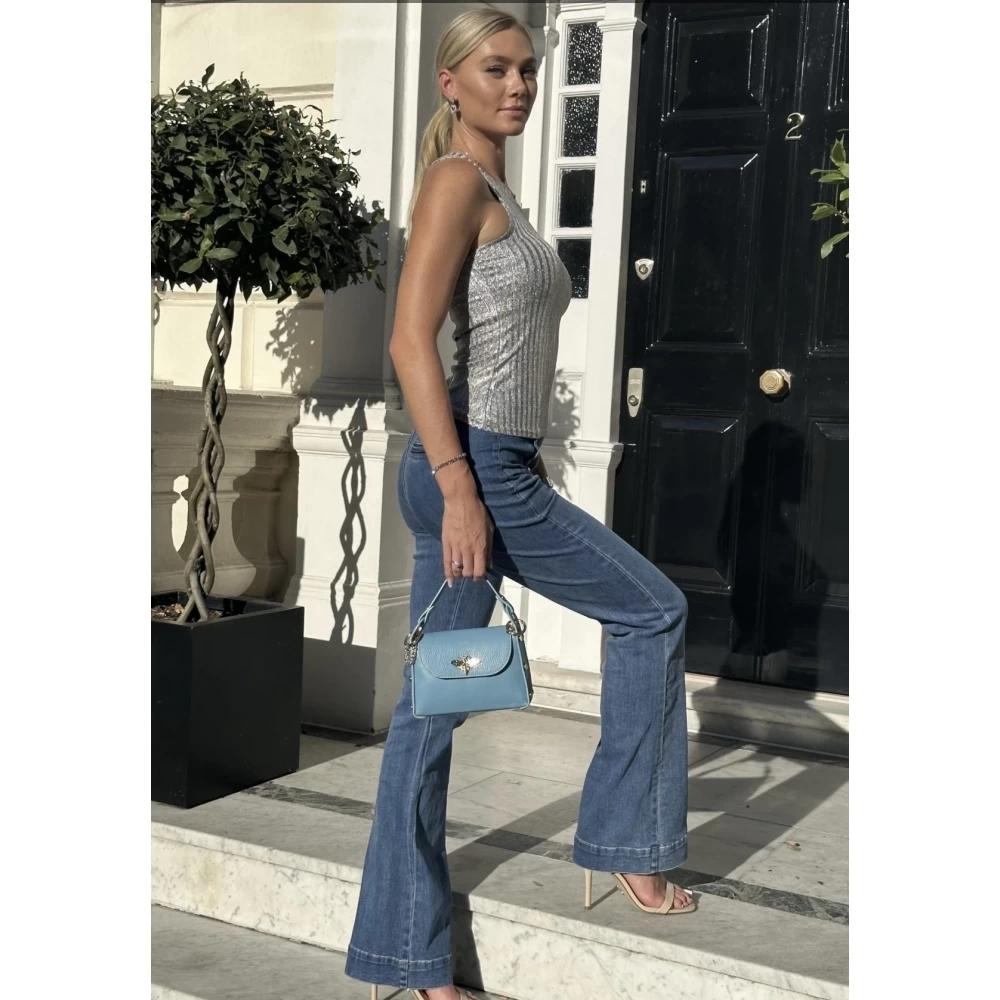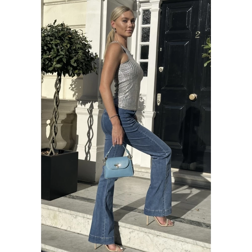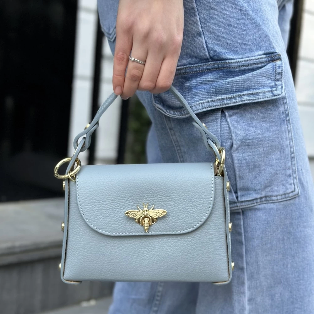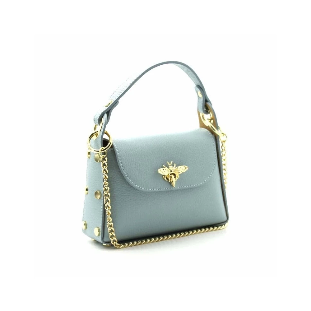 A nice box shape leather cross body bag that features a bee clasp and studded sides